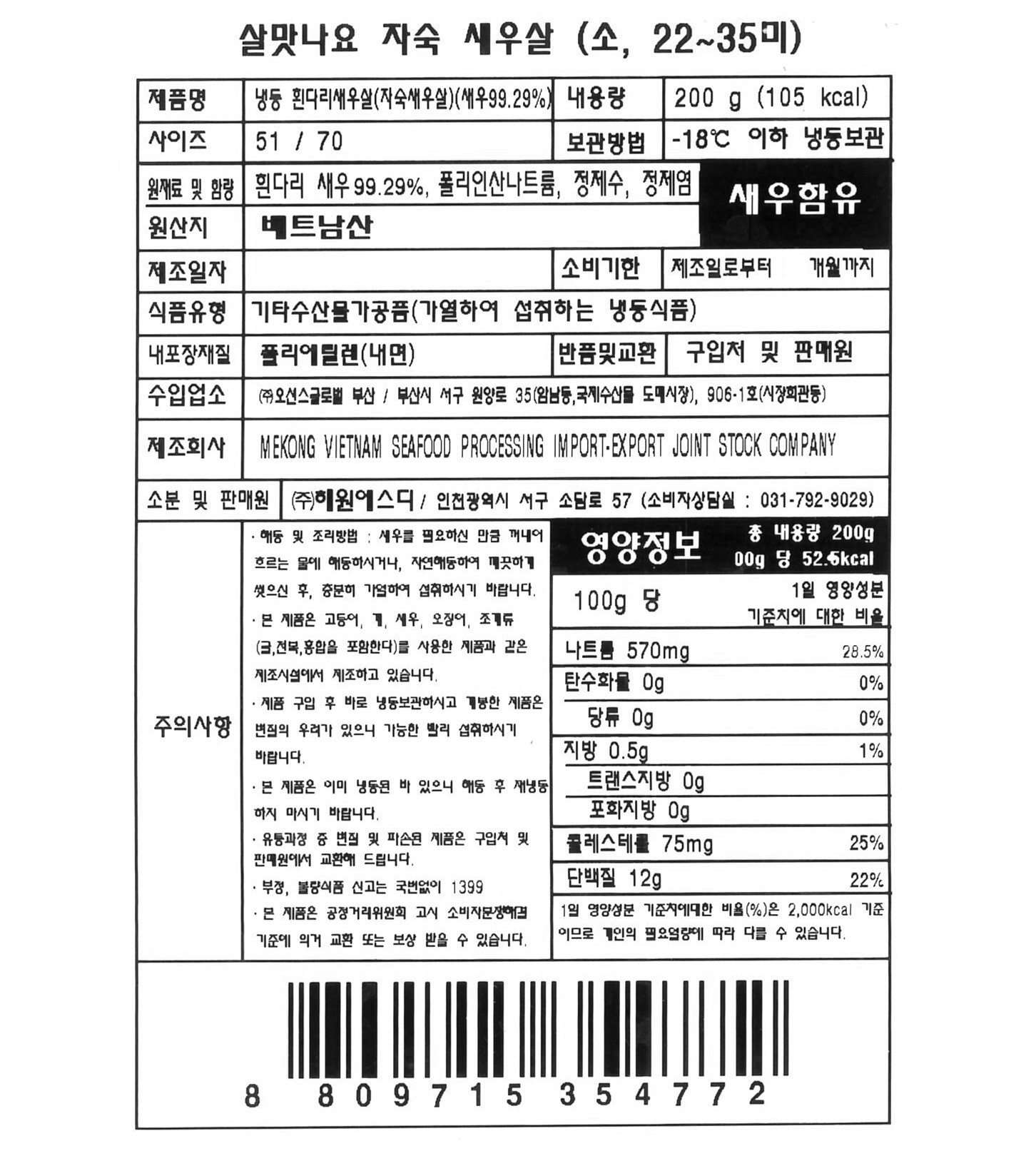 깔끔하게 손질된 자숙 흰다리새우살이에요. 머리와 꼬리, 껍질이 제거되어 요리하기 편리하죠. 고소하게 볶아 드셔도 맛있고, 감바스로 요리해도 좋아요. 한입 먹어보면, 부드러운 식감과 함께 느껴지는 은은한 단맛에 자꾸 손이 갈 거예요.