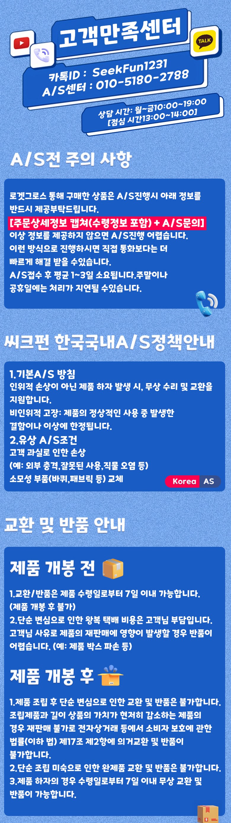 - ㆍ교환/반품에 관한 일반적인 사항은 판매자가 제시사항보다 관계법령이 우선합니다.