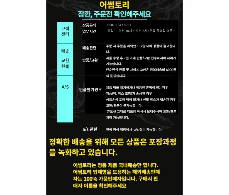 - ㆍ교환/반품에 관한 일반적인 사항은 판매자가 제시사항보다 관계법령이 우선합니다.