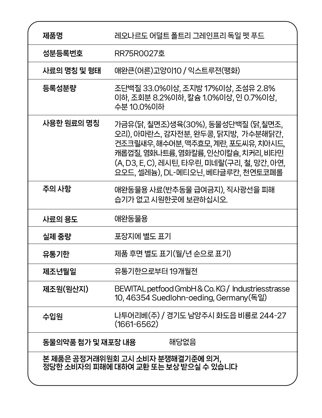 | 품명 및 모델명 | 레오나르도 어덜트 폴트리 GF | 인증/허가 사항 | 사료관리법에 따른 성분등록번호 : 컨텐츠 참조 |