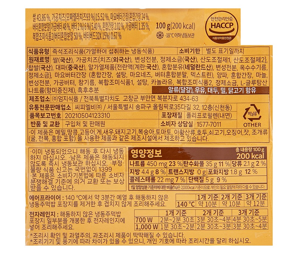 | 제품명 | 오븐에 구운 간장버터치즈 주먹밥 100g*8개 (냉동) | 식품의 유형 | 즉석조리식품(가열하여 섭취하는 냉동식품) |