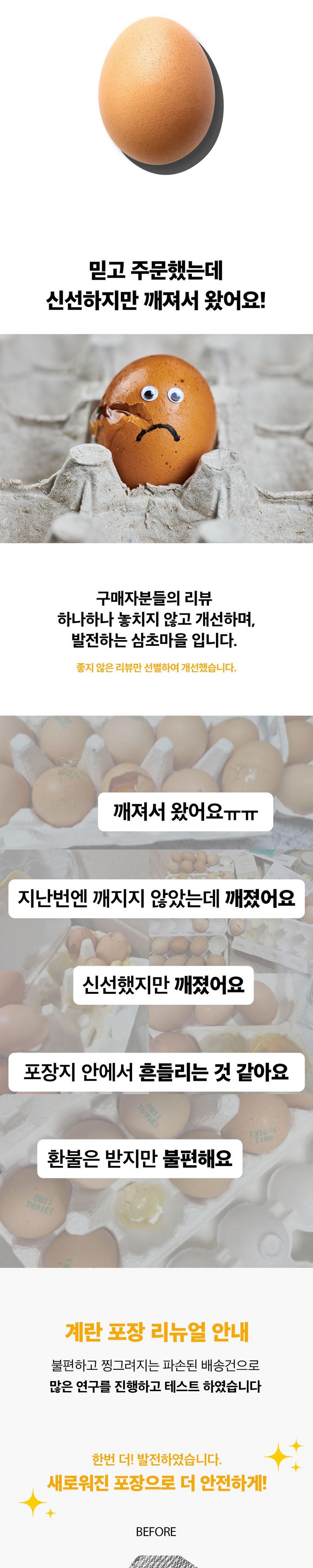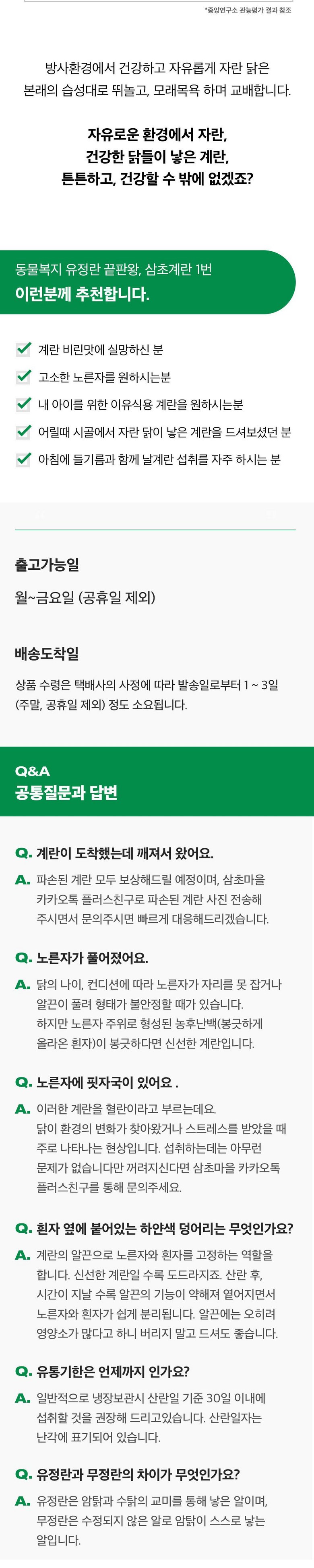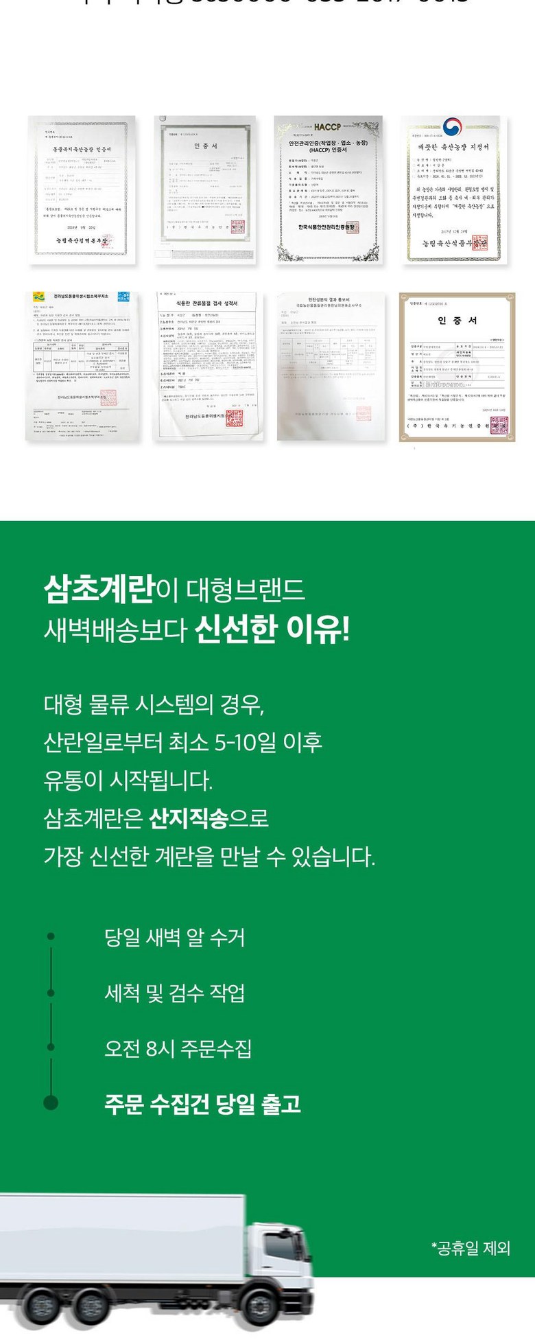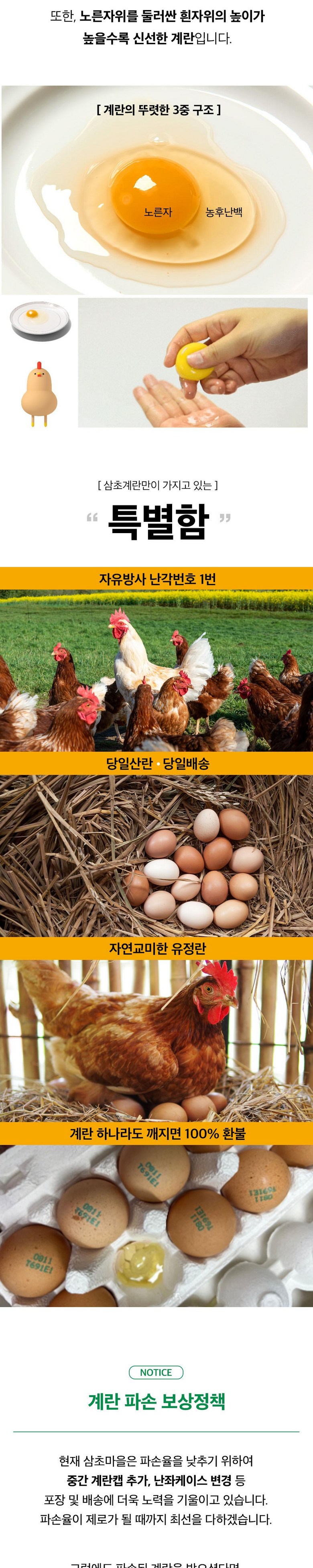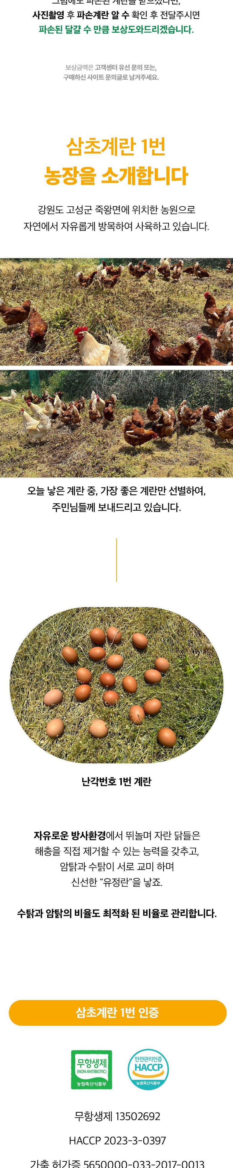 | 품목 또는 명칭 | 삼초계란 1번 20구, 30구, 40구 | 포장단위별 내용물의 용량(중량),수량,크기 | 총 중량 20구 1,040g 이상/ (구 기준 52g이상 대란) |