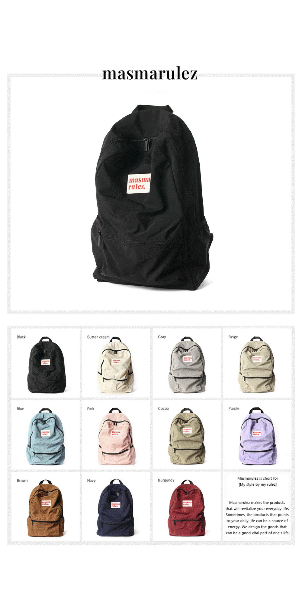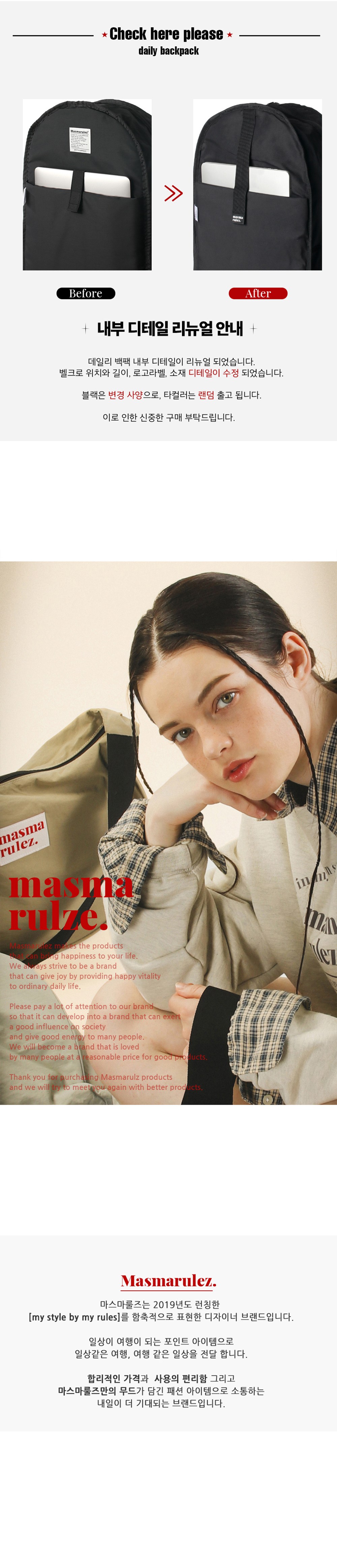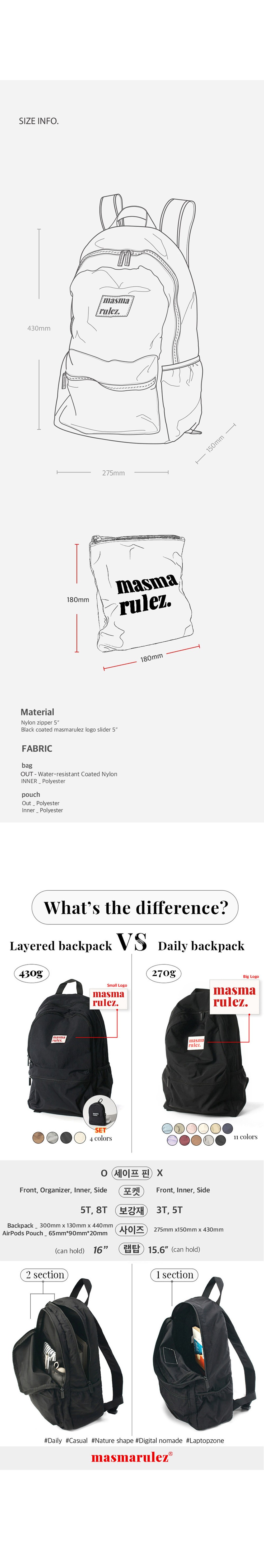 | 종류 | 백팩+파우치 | 소재 | 리뉴얼 전: (BAG) out: Water prrof coated nylon 100%, inner: polyester 100% / (pouch) out, inner: Polyester 100% | 리뉴얼 후: 코티드 나일론, 폴리에스터 |