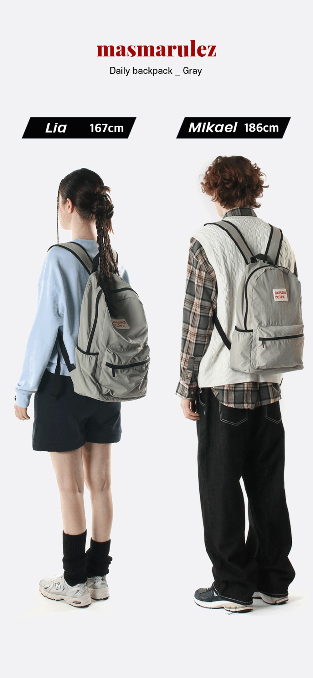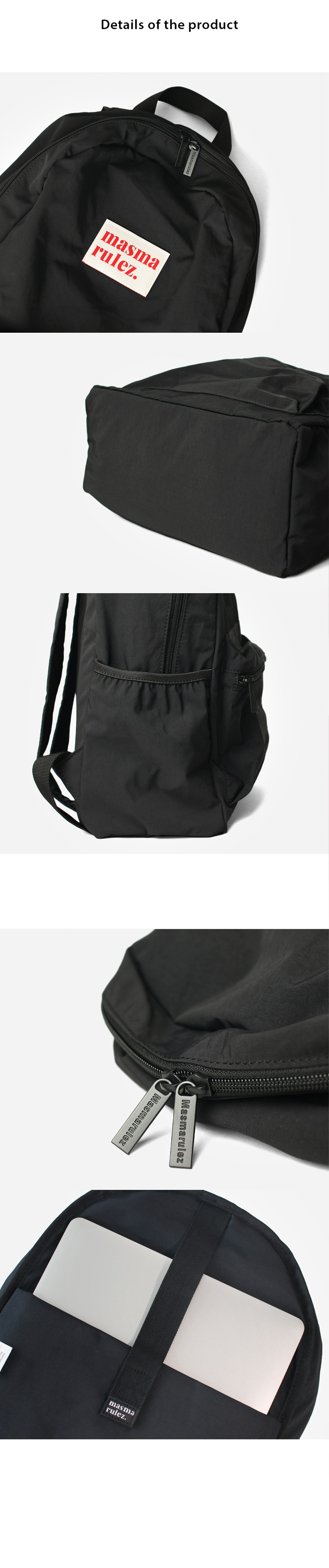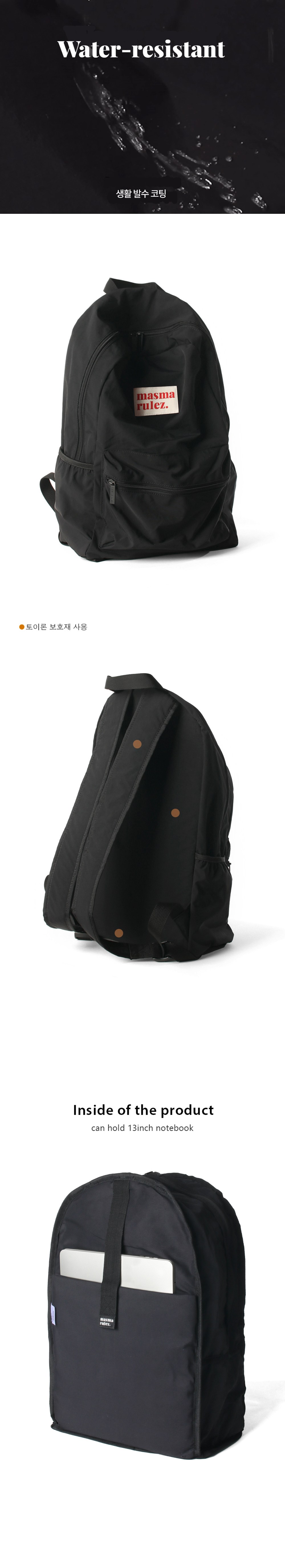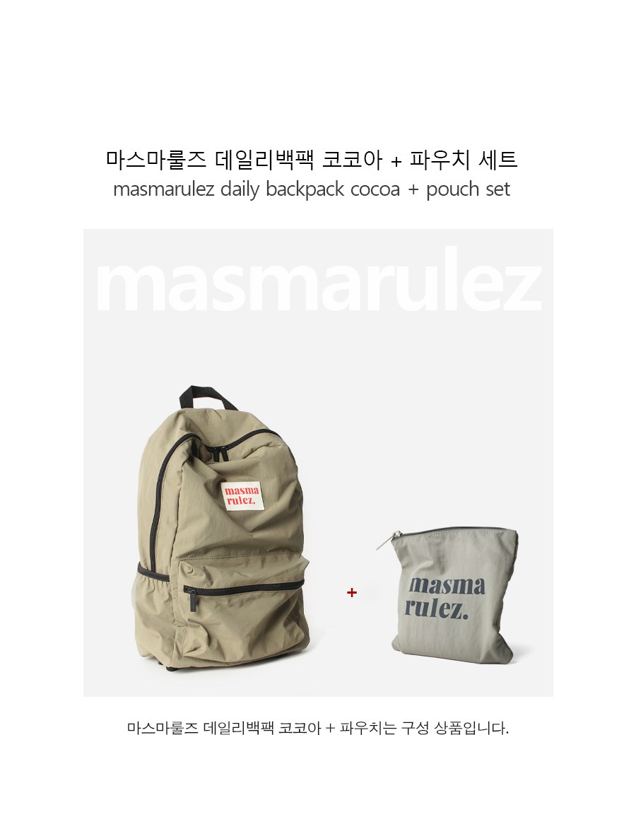 | 종류 | 백팩+파우치 | 소재 | 리뉴얼 전: (BAG) out: Water prrof coated nylon 100%, inner: polyester 100% / (pouch) out, inner: Polyester 100% | 리뉴얼 후: 코티드 나일론, 폴리에스터 |