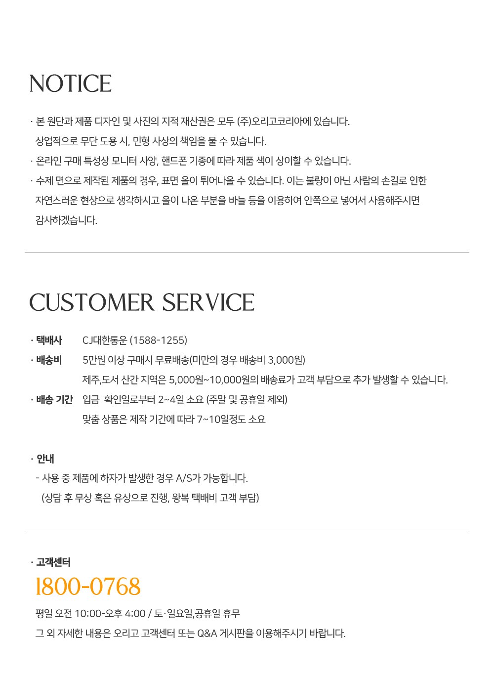 - ㆍ모니터 해상도의 차이로 인해 색상이나 이미지가 실제와 달라, 고객이 단순 변심으로 교환/반품을 무료로 요청하는 경우