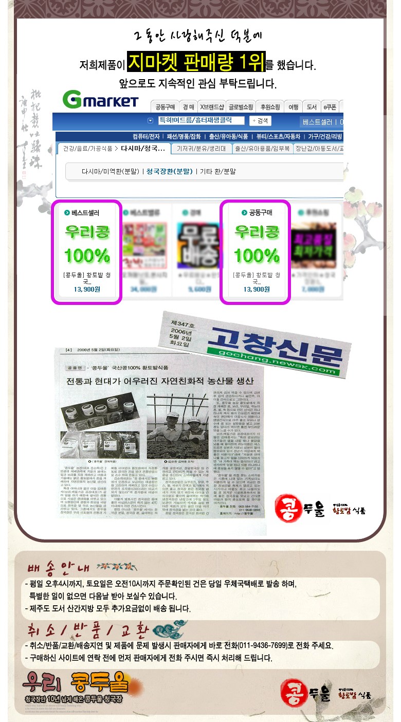| 생산자 및 소재지 | 콩두울 전북고창 | 제조연월일, 소비기한 또는 품질유지기한 | 별도표시 |