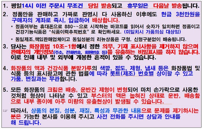 - ㆍ모니터 해상도의 차이로 인해 색상이나 이미지가 실제와 달라, 고객이 단순 변심으로 교환/반품을 무료로 요청하는 경우
