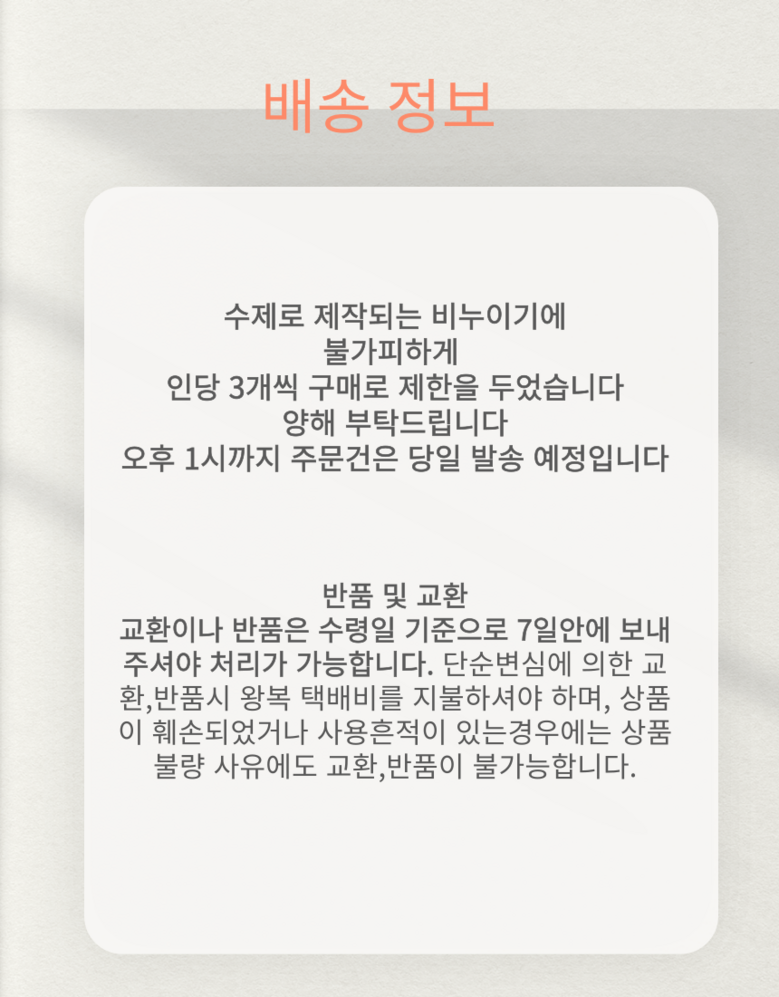 - ㆍ모니터 해상도의 차이로 인해 색상이나 이미지가 실제와 달라, 고객이 단순 변심으로 교환/반품을 무료로 요청하는 경우