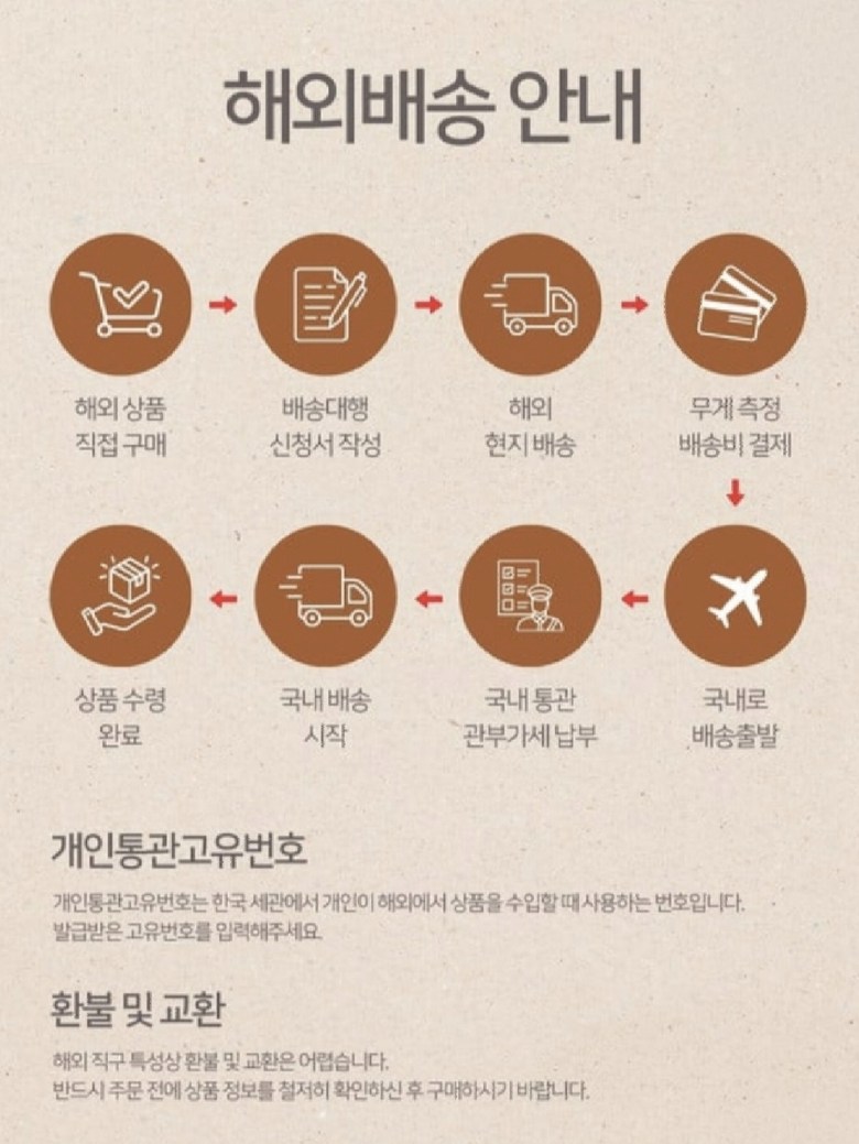- 법규 개정에 따라 개인통관고유부호 검증 절차가 강화되었습니다. 결제 단계에서 받는 사람의 정보가 관세청 등록 정보 (성명, 휴대폰, 개인통관고유부호, 주소) 와 일치하는지 확인해주세요.