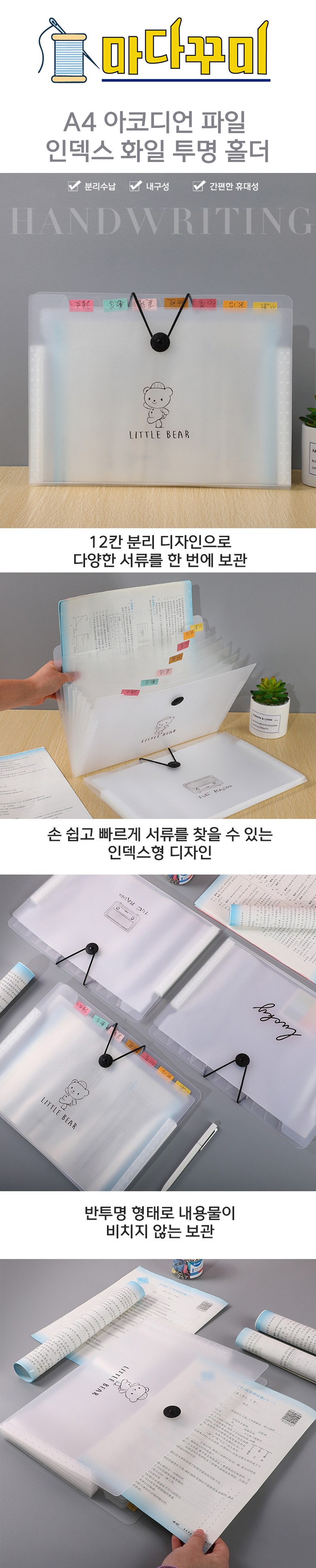 | 품명 및 모델명 | 마다꾸미 A4 아코디언 파일 인덱스 화일 투명 홀더 | 인증/허가 사항 | 해당없음(14세이상) |