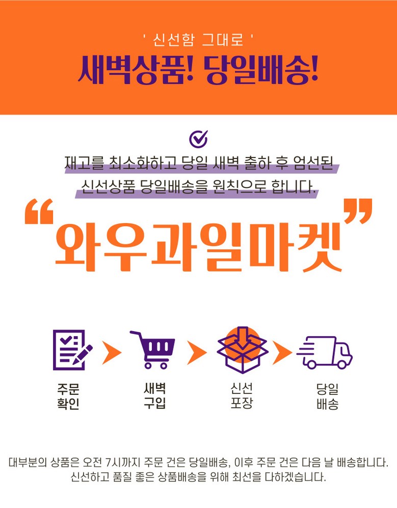 | 배송방법 | 신선/냉장/냉동 | 배송비 | 무료배송 · 도서산간 추가 배송비 - 제주 지역: 3,000원 - 도서산간 지역: 6,000원 |