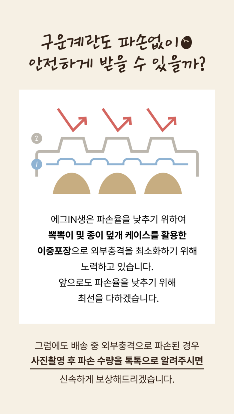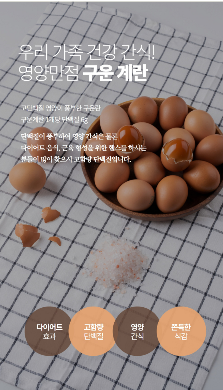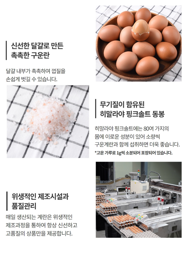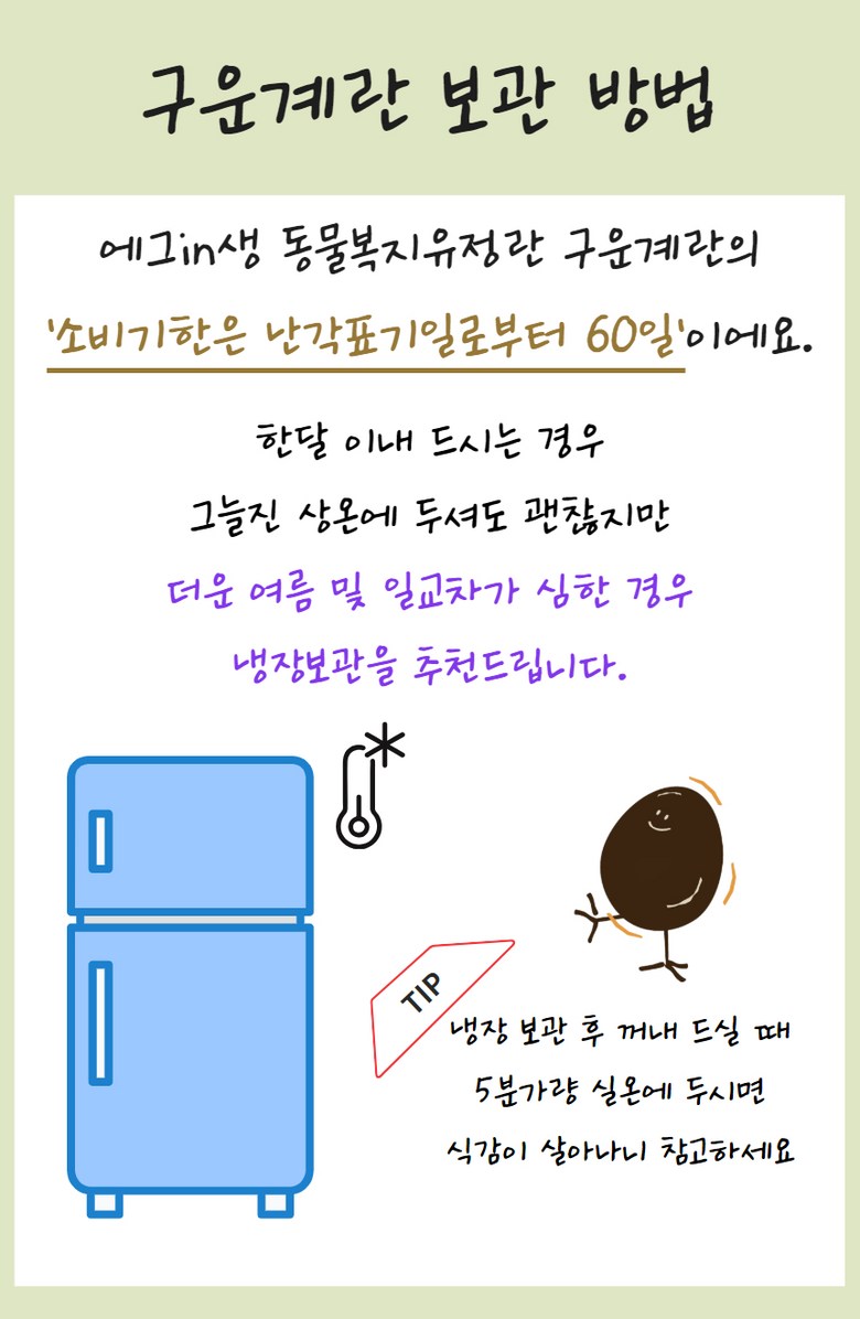 | 제조연월일, 소비기한 또는 품질유지기한 | 소비기한 : 계란난각 표기일로부터 60일*장기간 보관 후 드시는 경우 냉장보관을 추천드립니다. | 세부 품목군별 표시사항 | 상품 상세페이지 참조 |