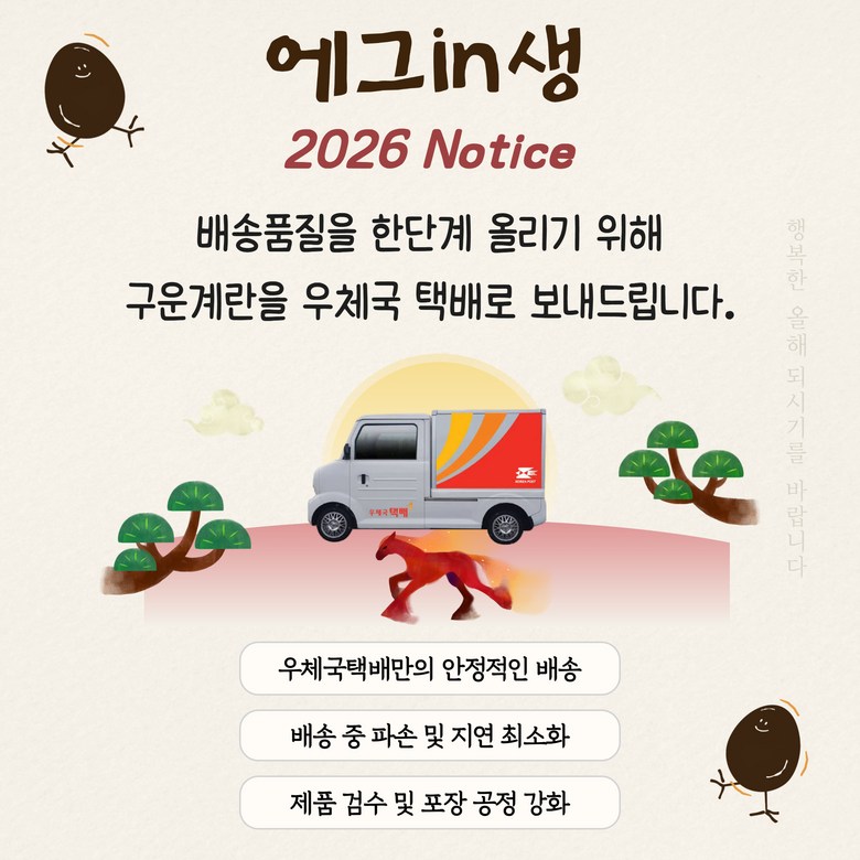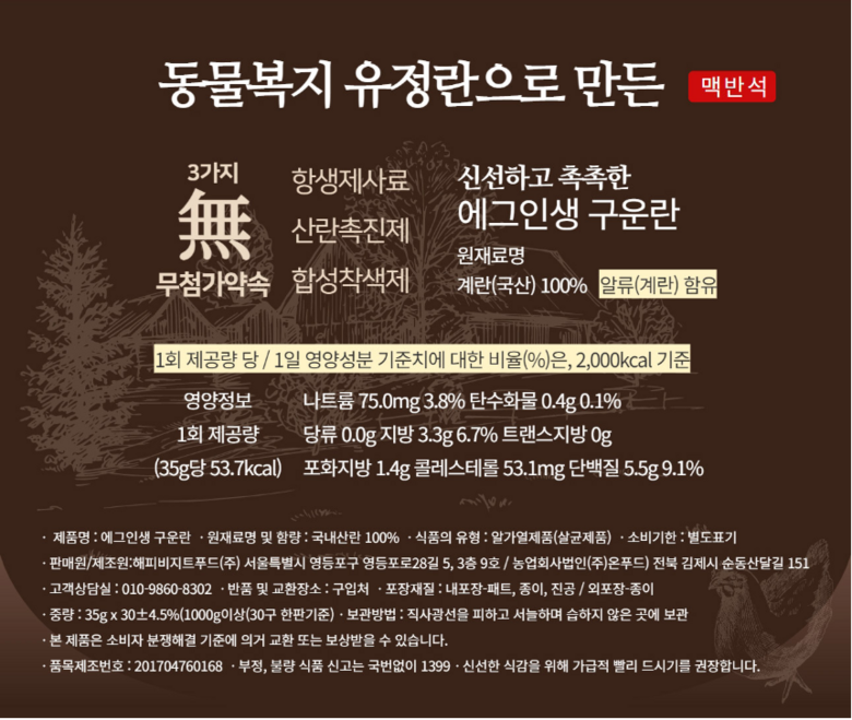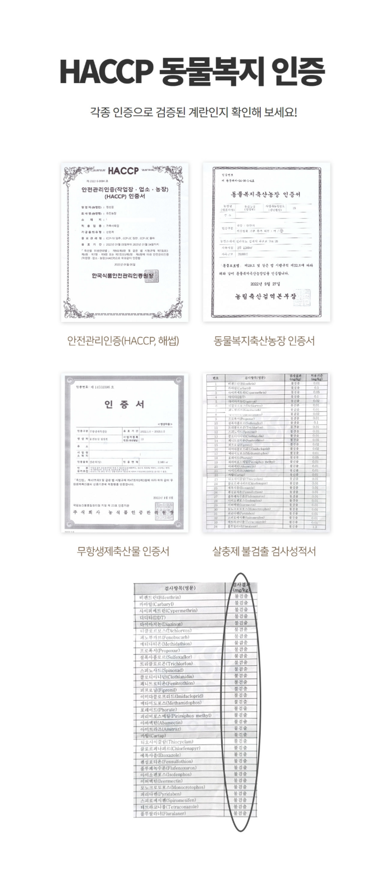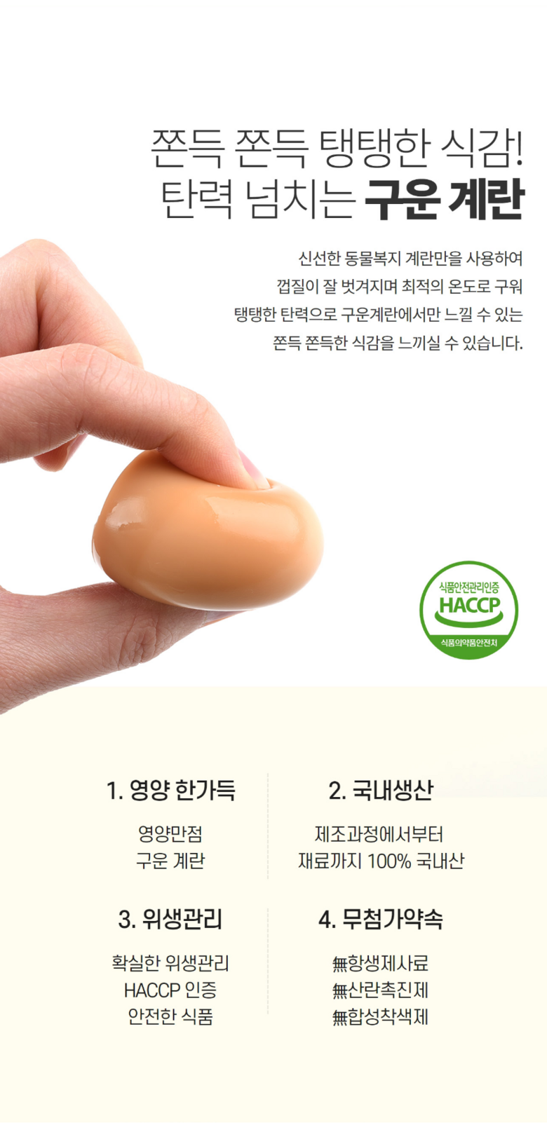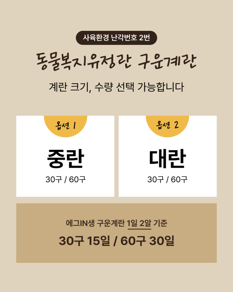 | 제조연월일, 소비기한 또는 품질유지기한 | 소비기한 : 계란난각 표기일로부터 60일*장기간 보관 후 드시는 경우 냉장보관을 추천드립니다. | 세부 품목군별 표시사항 | 상품 상세페이지 참조 |