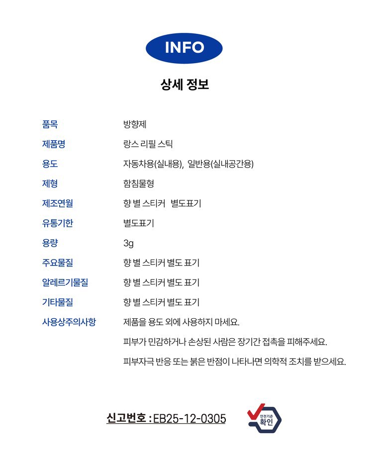 | 품목 및 제품명 | 상품 상세페이지 참조 | 용도(표백제의 경우 계열을 함께표시) 및 제형 | 상품 상세페이지 참조 |