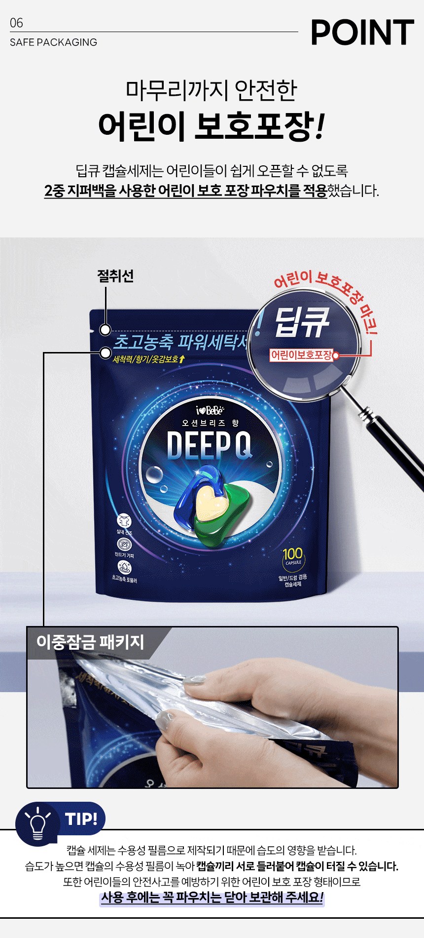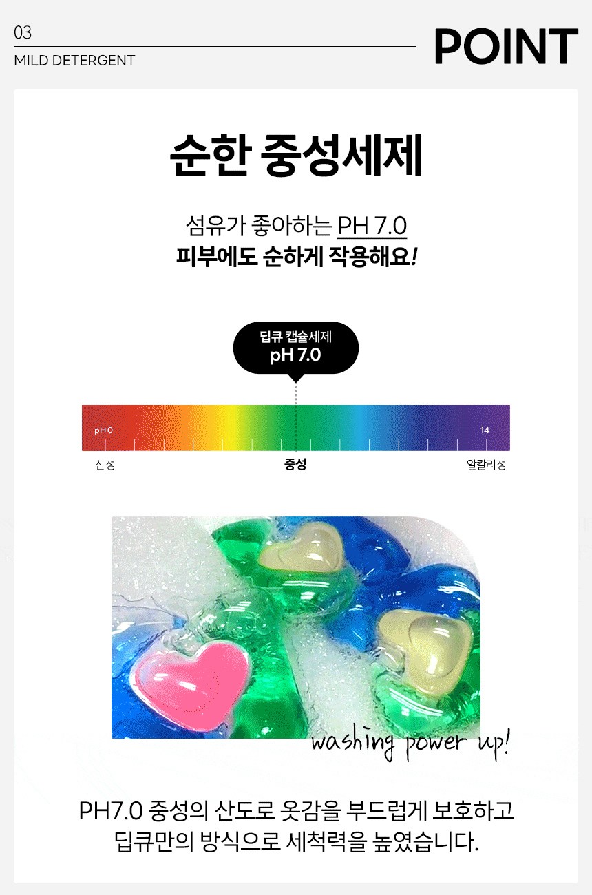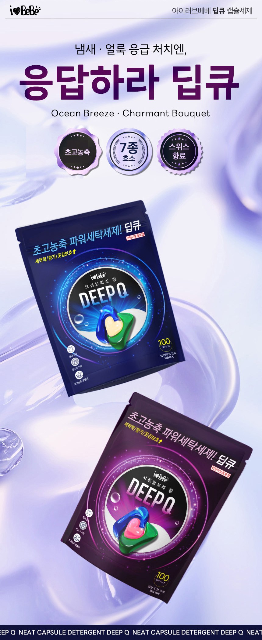 | 품목 및 제품명 | 세탁세제/ 아이러브베베 딥큐 캡슐세제 오션브리즈향 | 용도(표백제의 경우 계열을 함께표시) 및 제형 | 섬유용,신발용 / 캡슐형 |