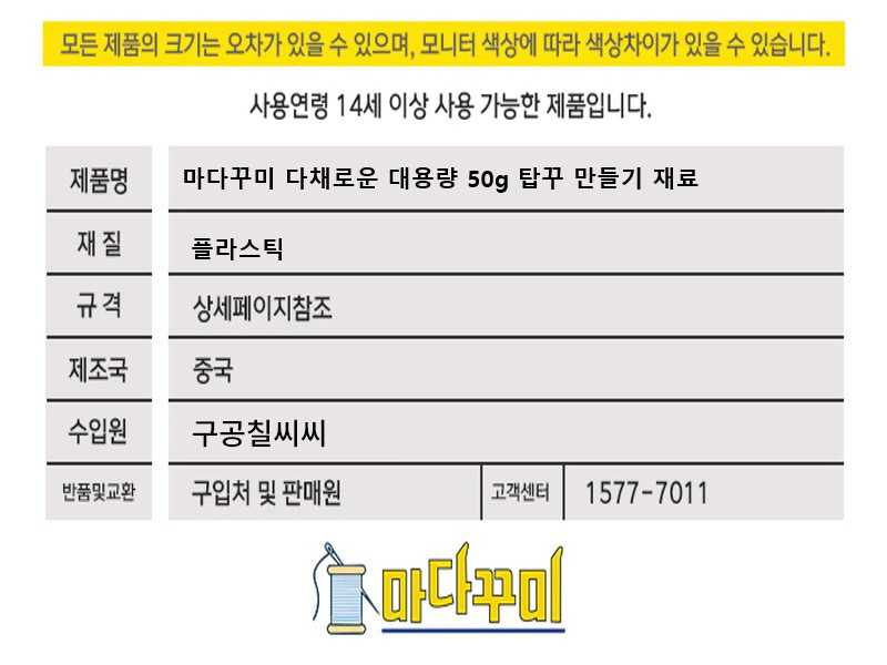 | 품명 및 모델명 | 마다꾸미 다채로운 대용량 50g 탑꾸 만들기 재료 블루 | 인증/허가 사항 | 해당없음(14세이상) |