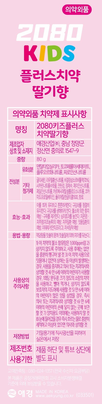 | 품명 및 모델명 | 2080키즈플러스 치약 딸기향 | 인증/허가 사항 | 의약외품 |