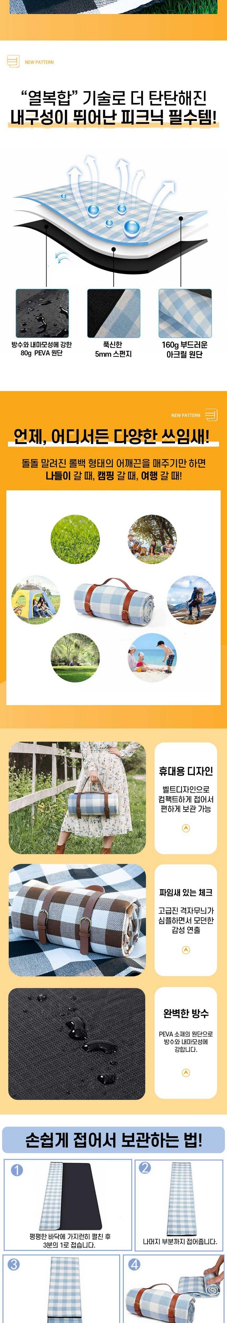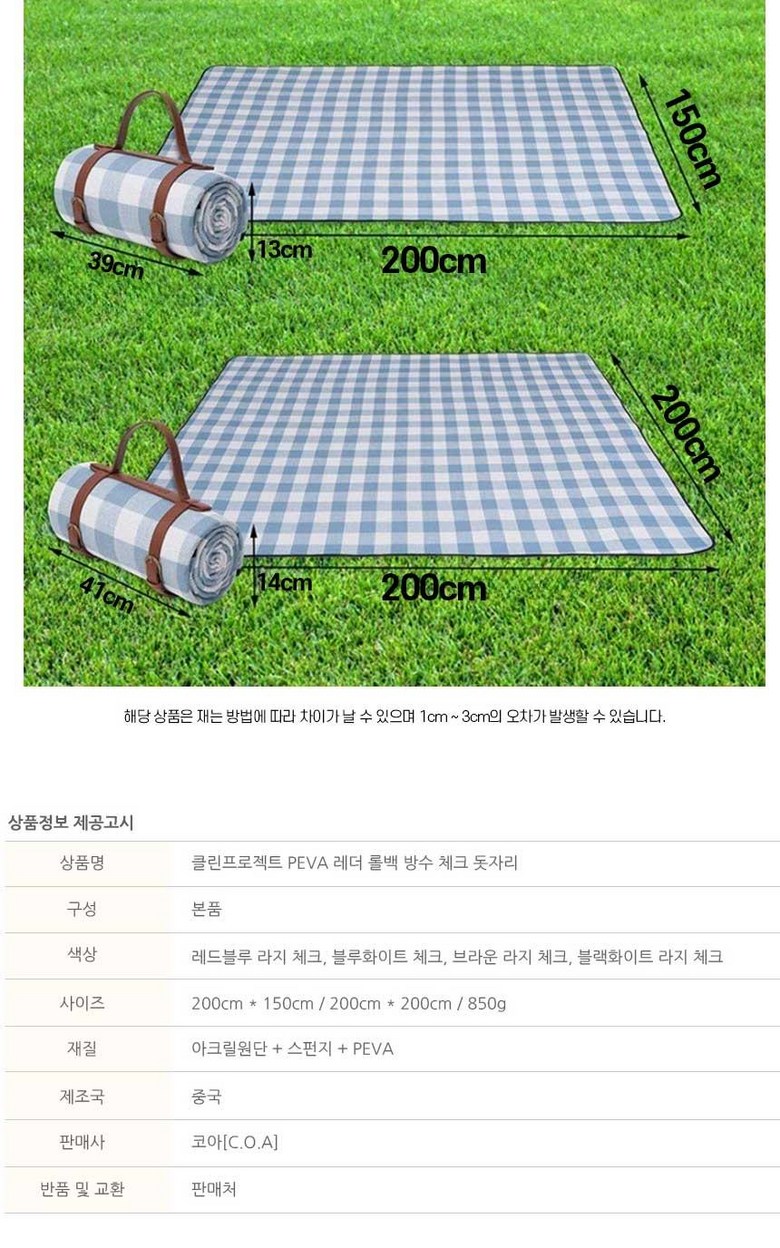 | 품명 및 모델명 | 가죽 롤백 방수 체크 돗자리 | 인증/허가 사항 | 해당사항없음 |