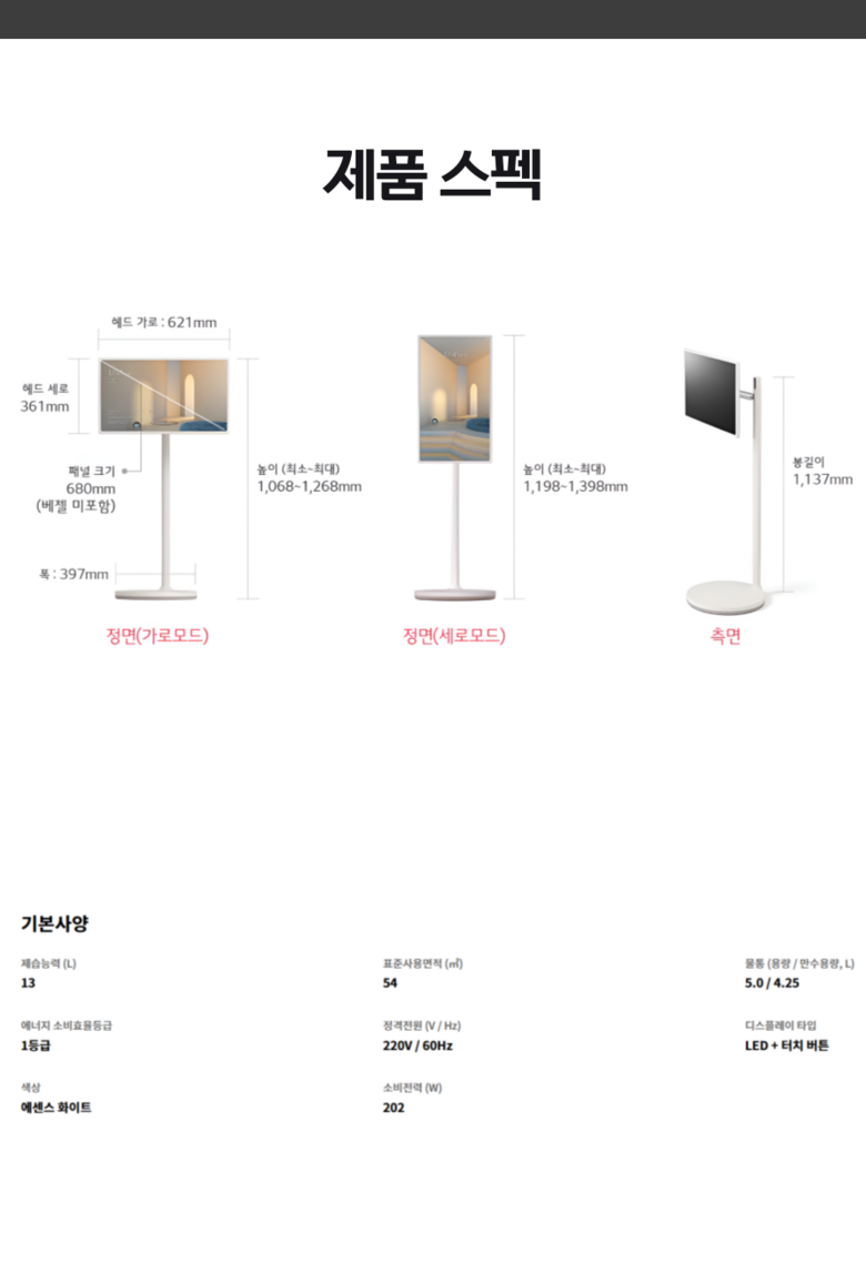 | 정격전압, 소비전력 | 상품 상세페이지 참조 | 에너지소비효율등급 | 상품 상세페이지 참조 |