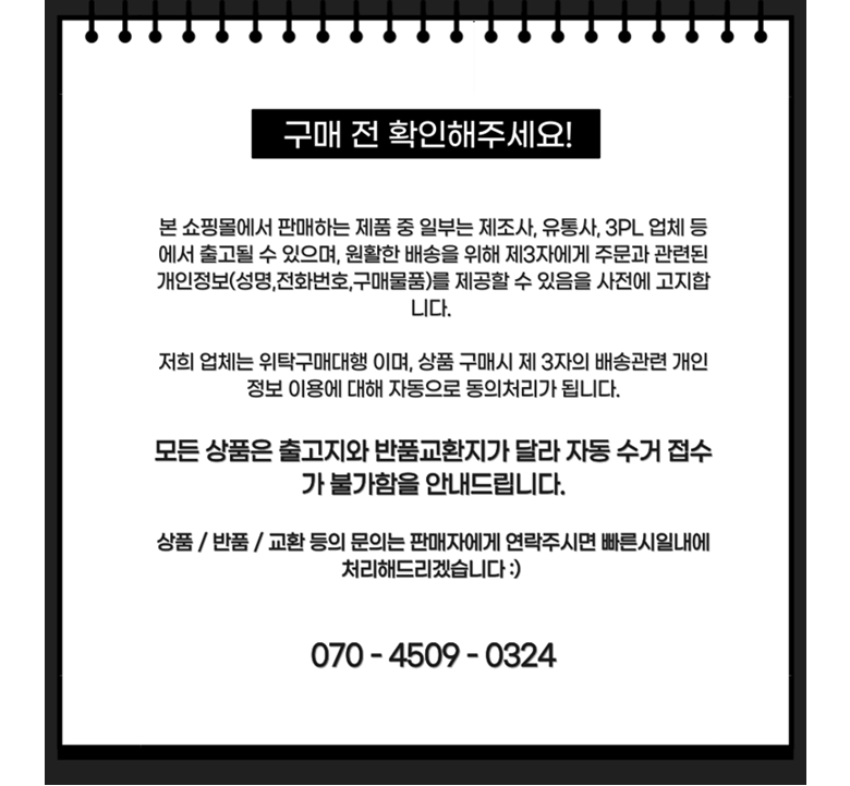 - ㆍ모니터 해상도의 차이로 인해 색상이나 이미지가 실제와 달라, 고객이 단순 변심으로 교환/반품을 무료로 요청하는 경우