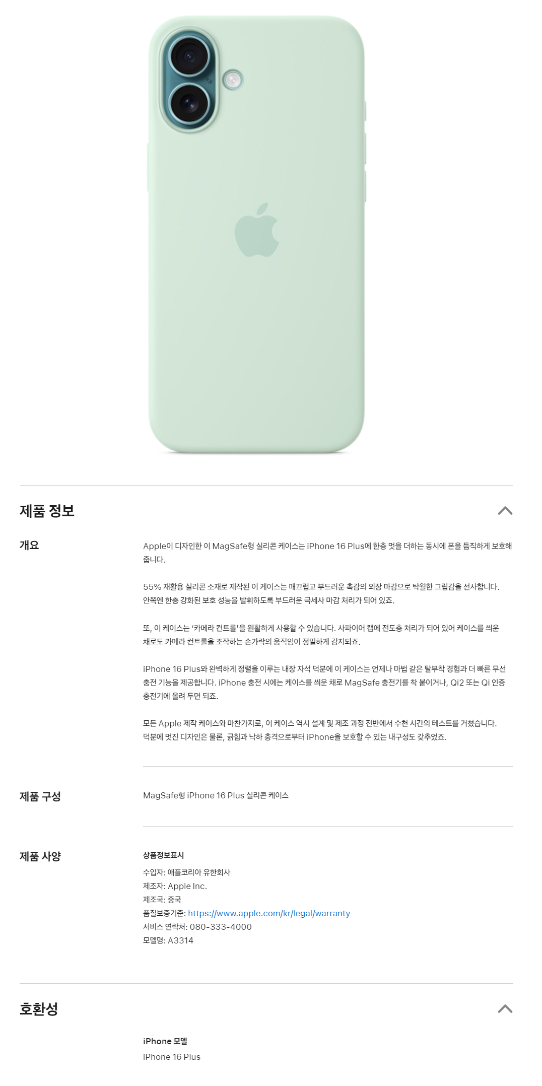 | 품명 및 모델명 | Apple 정품 아이폰 16 시리즈 맥세이프 실리콘 케이스 A3314 | 인증/허가 사항 | 해당없음 |