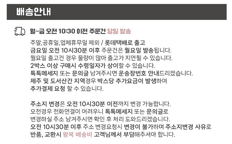 | 배송방법 | 순차배송 | 배송비 | 무료배송 · 도서산간 추가 배송비 - 제주 지역: 5,000원 - 도서산간 지역: 8,000원 |