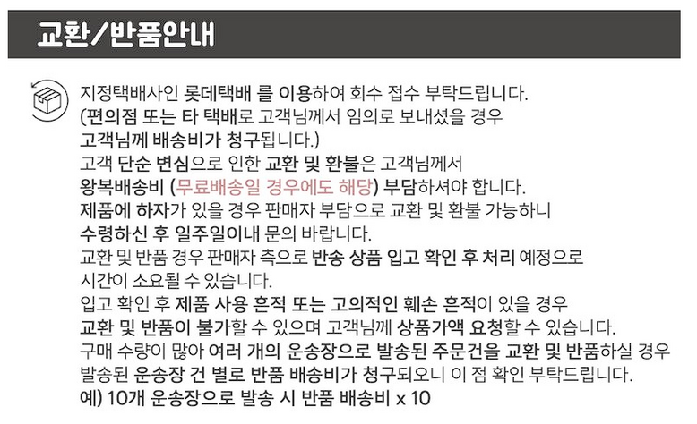 - ㆍ모니터 해상도의 차이로 인해 색상이나 이미지가 실제와 달라, 고객이 단순 변심으로 교환/반품을 무료로 요청하는 경우