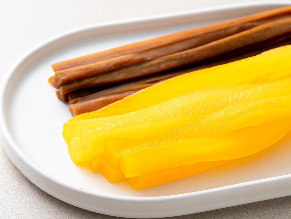 길쭉하게 손질된 치자단무지와 우엉