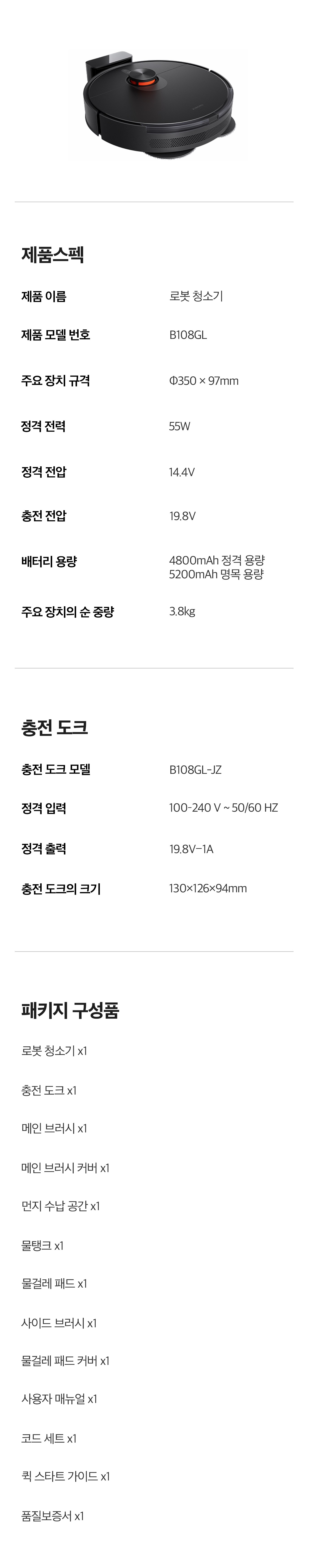 | 품명 및 모델명 | 샤오미 로봇청소기 S20+ / B108GL | KC 인증정보 | 본품: R-R-xmi-B108GL / 충전도크: HU073392-24002, R-R-xmi-B108GL-JZ / 코드: |