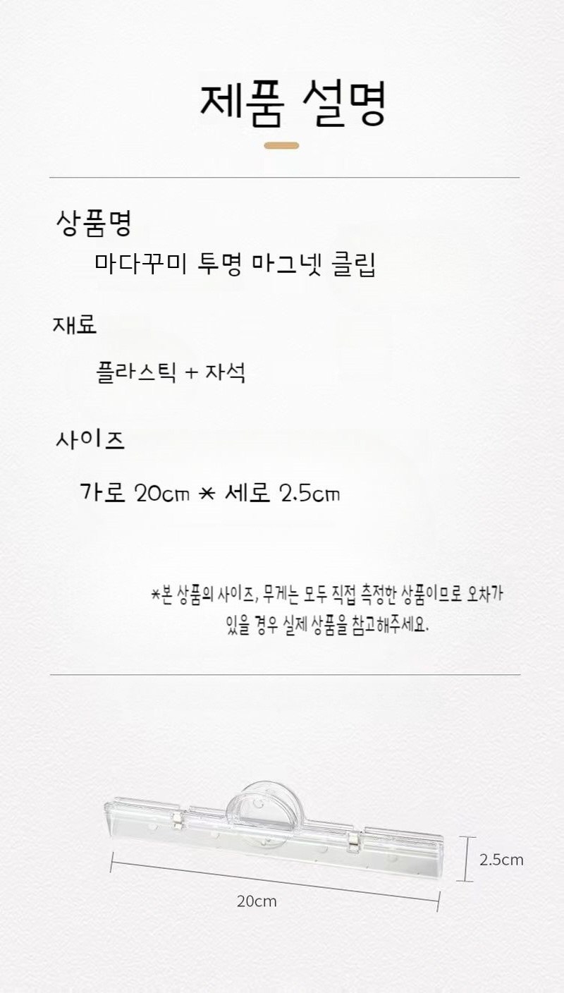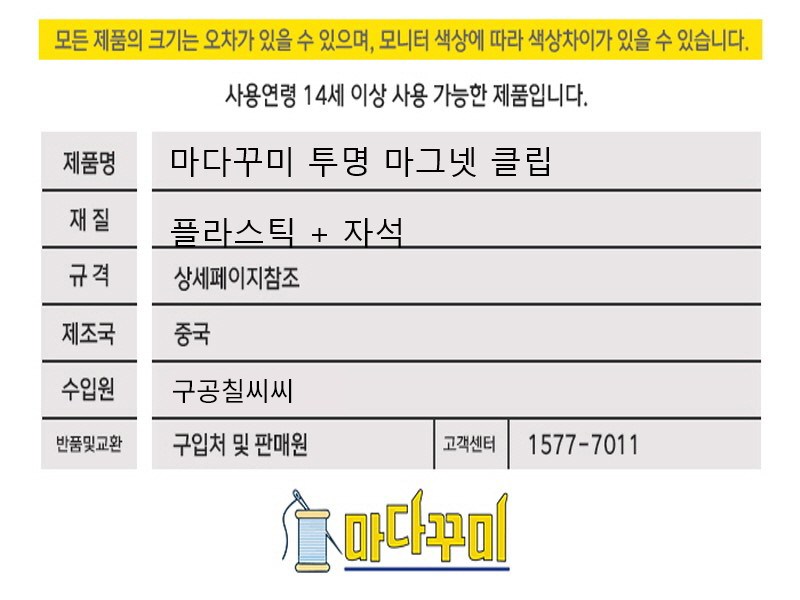 | 품명 및 모델명 | 마다꾸미 투명 마그넷 클립 2개 | 인증/허가 사항 | 해당없음(14세이상) |