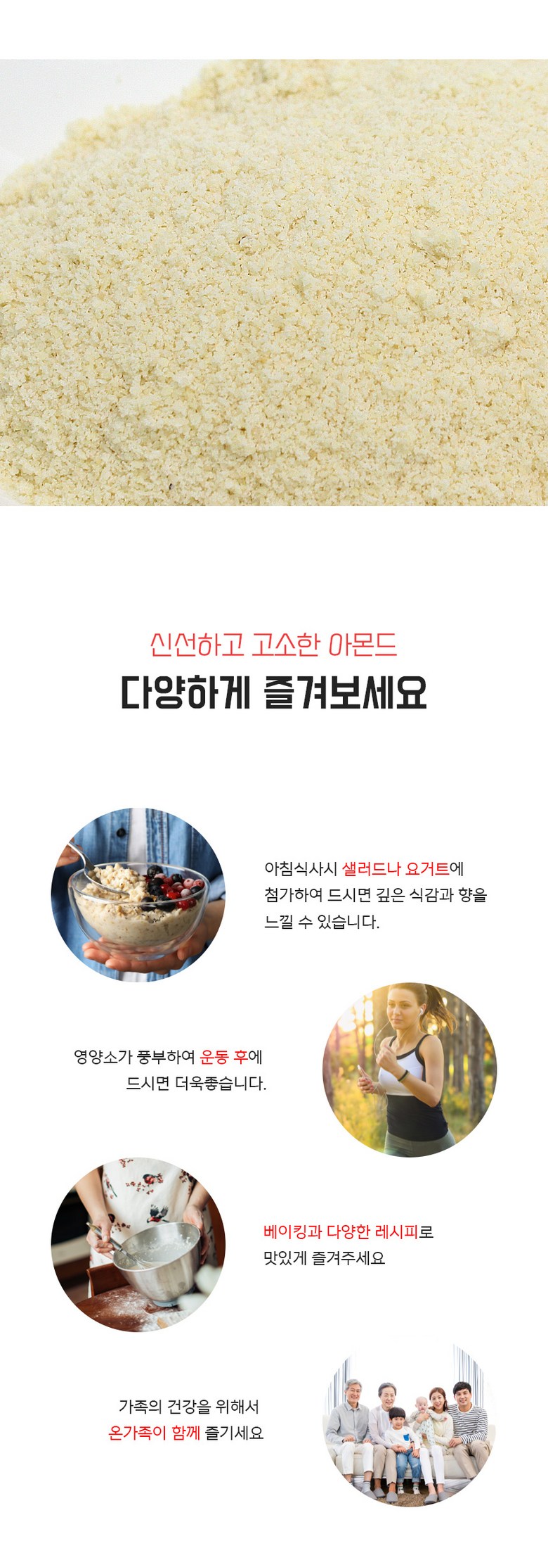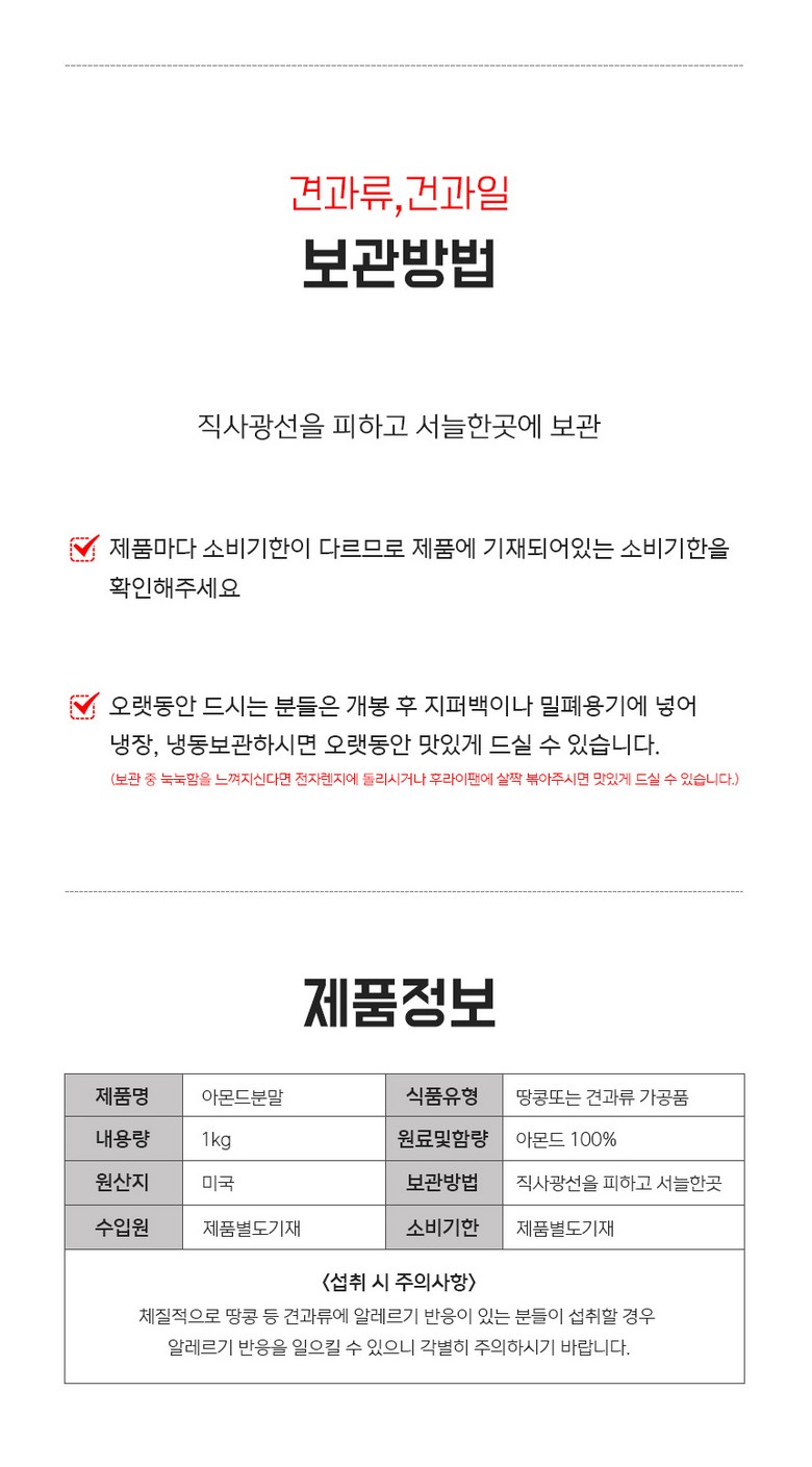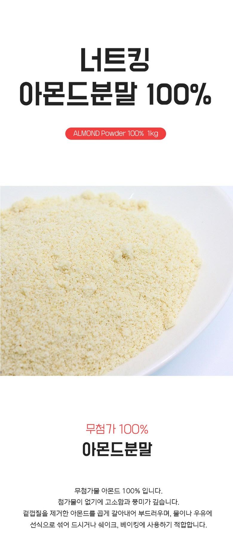 | 품목 또는 명칭 | 너트킹 아몬드가루 1kg 100% | 포장단위별 내용물의 용량(중량),수량,크기 | 1kg, 1봉 |
