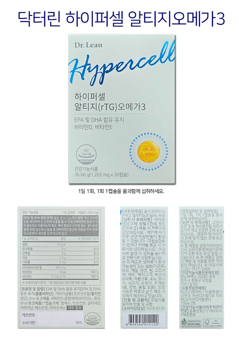 | 원료명 및 함량 | EPA 및 DHA함유 유지[EPA 및 DHA함유 유지(콜롬비아산),기타가공품{코코넛오일(필리핀산)}],d-α-토코페롤,비타민D3혼합제제(비타민D3,팜유,dl-α-토코페롤) 캡슐기제 : 정제수, 변성전분, 글리세린,카라기난,덱스트린,카카오색소 [대두 함유] | 영양정보 | 1일 섭취량 : 1캡슐 (1,202mg) 열량 : 10kcal, 탄수화물 0g(0%), 단백질 0g(0%), 지방 1.2g(2%), 나트륨 0mg(0%), EPA와 DHA의 합 600mg, 비타민D 10㎍(100%), 비타민E 11mg α-TE(100%) |