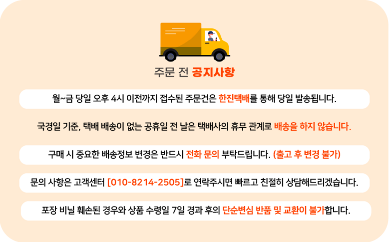 | 배송기간 | ㆍ도서산간 지역 등은 배송에 3-5일이 더 소요될 수 있습니다. - 천재지변, 물량 수급 변동 등 예외적인 사유 발생 시, 다소 지연될 수 있는 점 양해 부탁드립니다. | ||