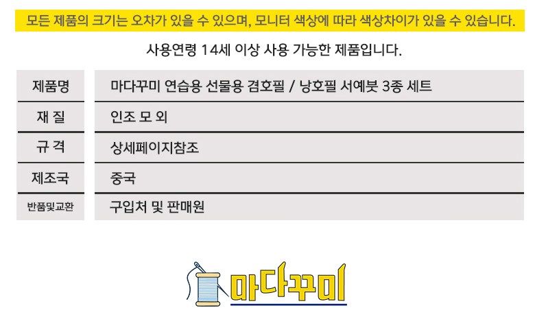 | 품명 및 모델명 | 마다꾸미 연습용 겸호필 서예붓 3종 | 인증/허가 사항 | 해당 없음 (14세 이상) |