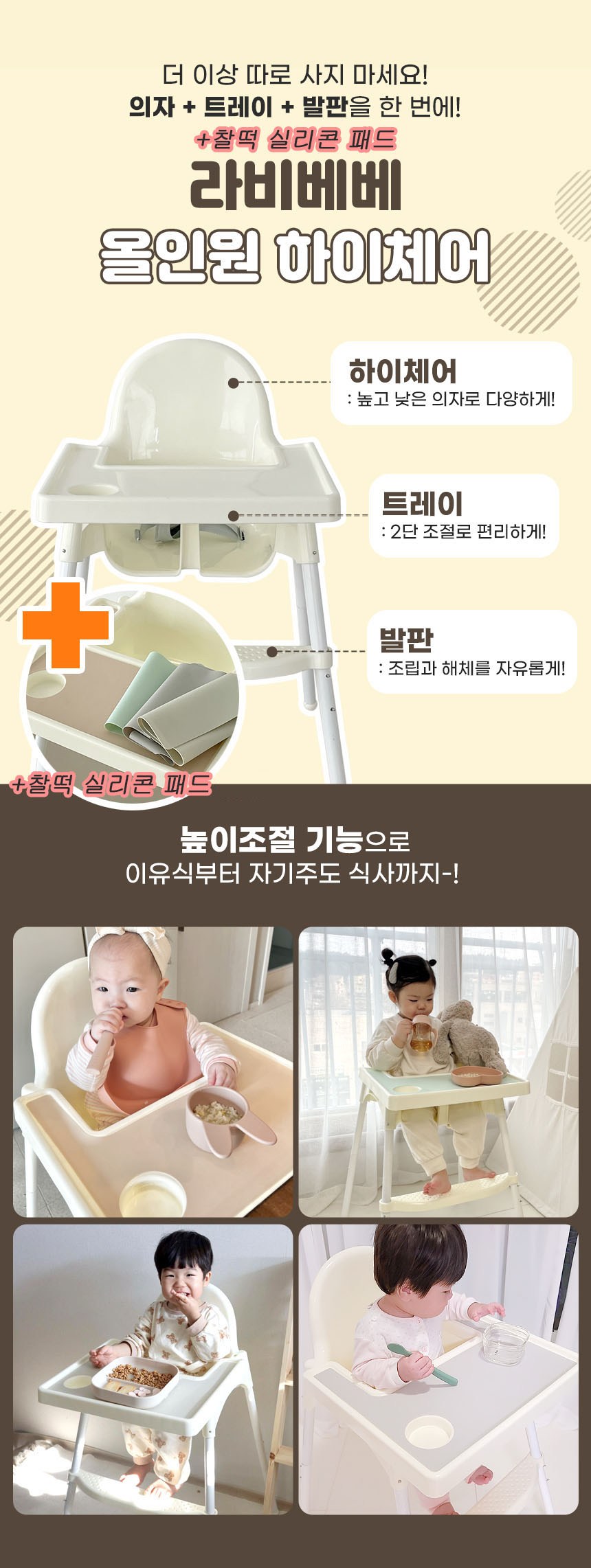 | 품명 및 모델명 | 라비베베 하이체어 1개 + 실리콘 패드 베이지 | KC 인증정보 | 하이체어 : CB081R203-3001, 실리콘 패드 : 유/KC마크 |