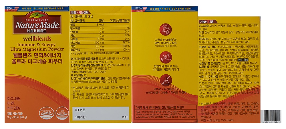 | 제품명 | 웰블렌즈 면역&에너지 울트라 마그네슘 파우더 Wellblends Immune & Energy Ultra Magnesium Powder | 제조업소의 명칭과 소재지 | 컨텐츠참조 |