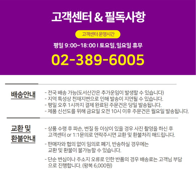 - ㆍ교환/반품에 관한 일반적인 사항은 판매자가 제시사항보다 관계법령이 우선합니다.