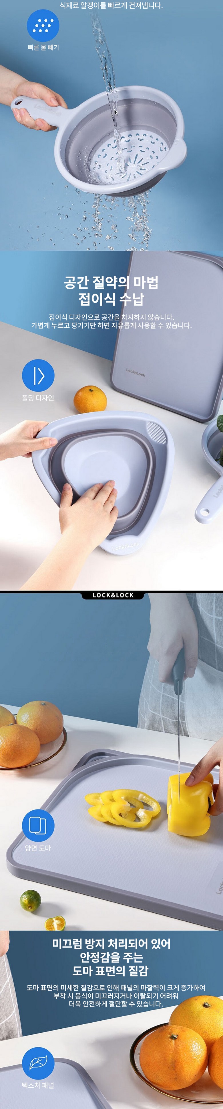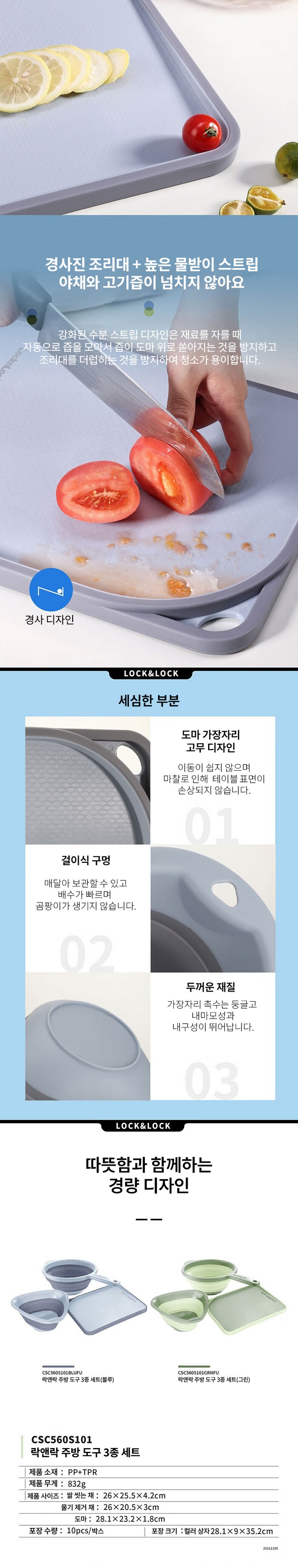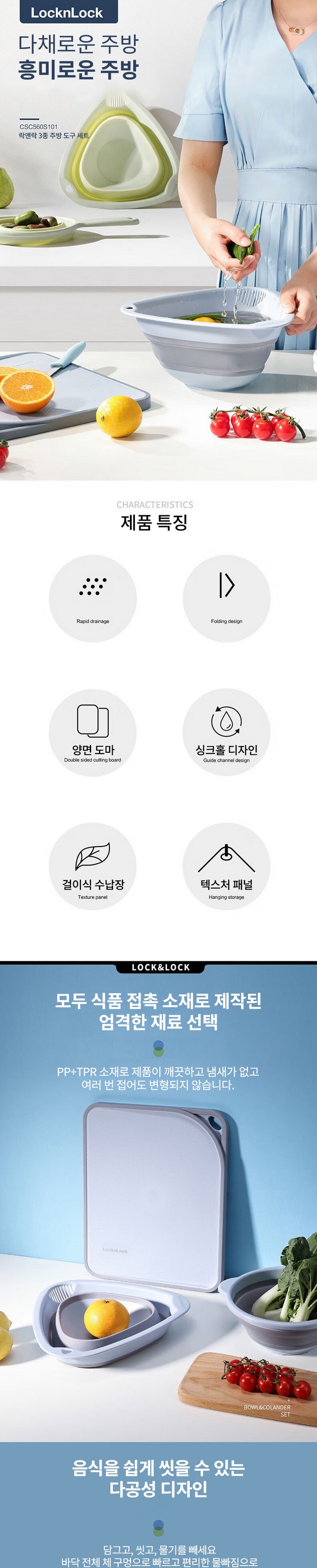 락앤락 도마 + 채소 물빠짐 바구니 + 쌀 물빠짐 바구니 3종 세트 CSC560S101BLUFU