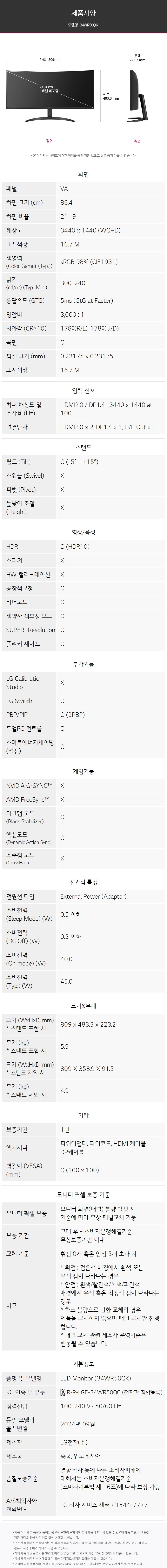 | 품명 및 모델명 | LG 울트라와이드 모니터 / 34WR50QK | KC 인증정보 | 유/KC마크,R-R-LGE-34WR50QC |