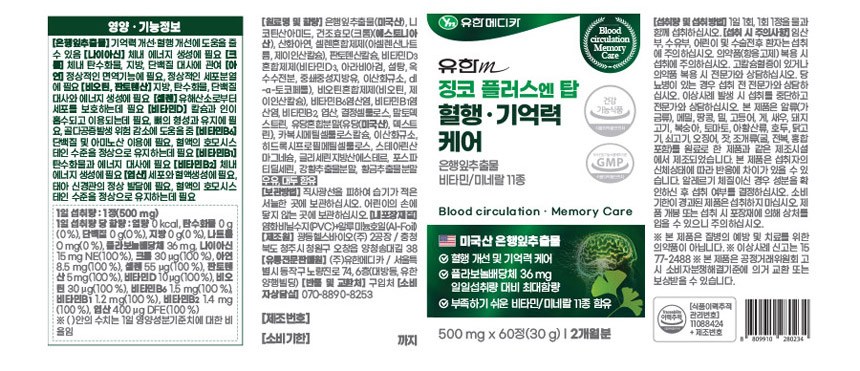 | 제품명 | 징코 플러스엔 탑 혈행 · 기억력 케어 | 제조업소의 명칭과 소재지 | 컨텐츠 참조 |