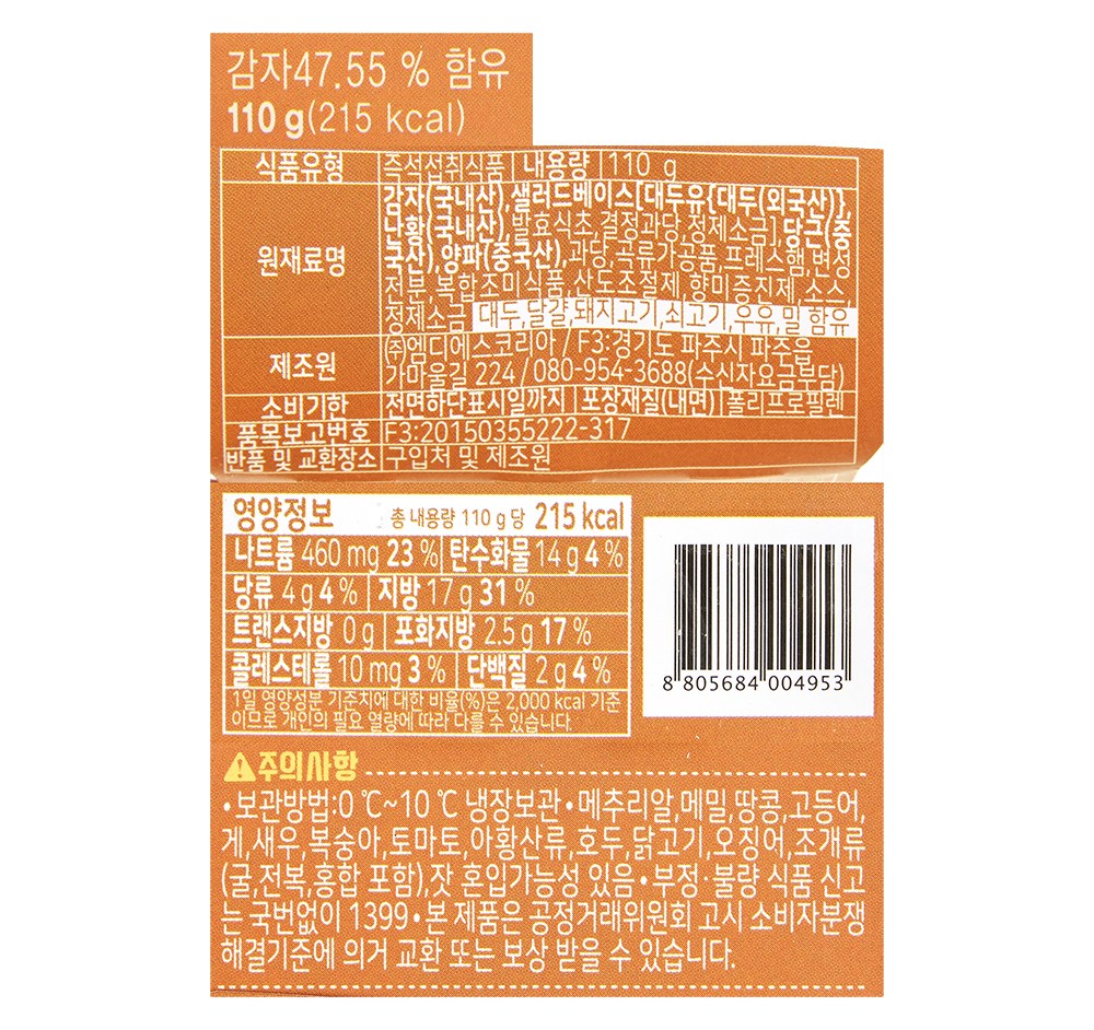 | 제품명 | 감자샐러드 | 식품의 유형 | 컨텐츠참조 |
