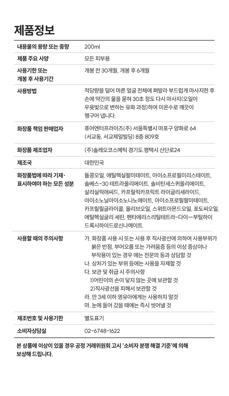 | 화장품제조업자, 화장품책임판매업자 및 맞춤형화장품판매업자 | 제조업자 : (주)솔레오코스메틱 / 책임판매업자 : 퓨어엔터프라이즈(주) | 제조국 | 대한민국 |