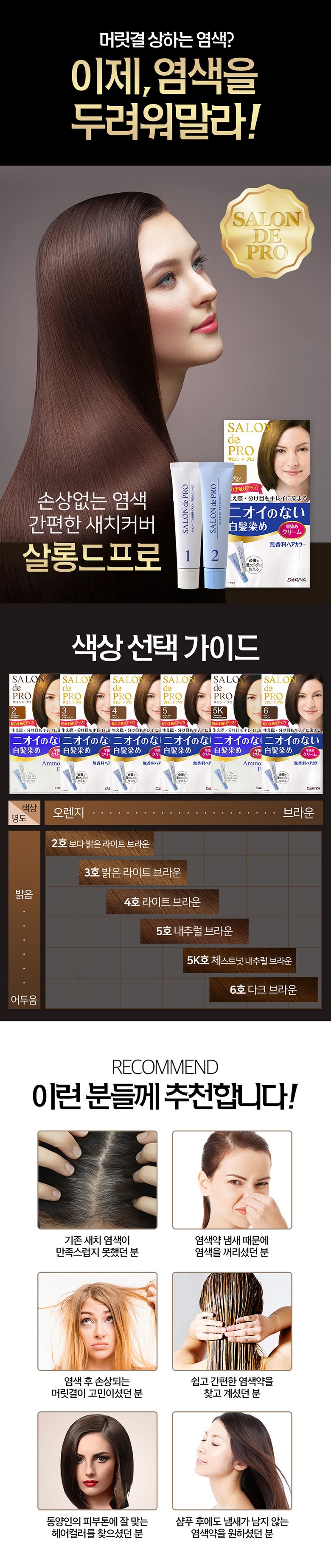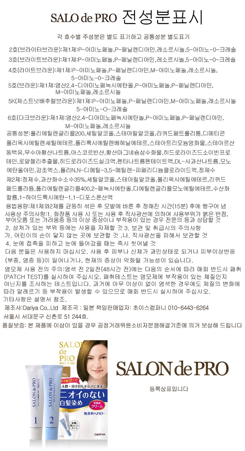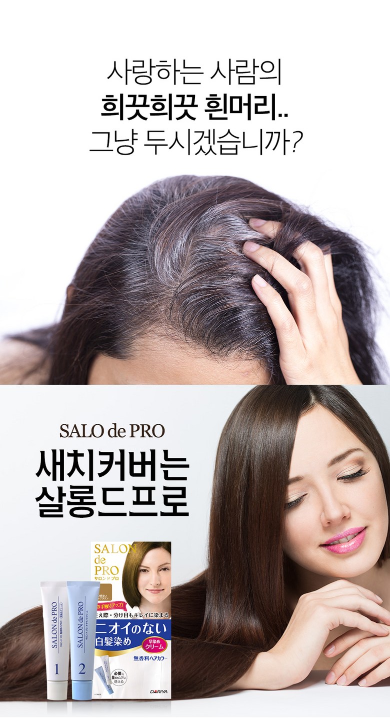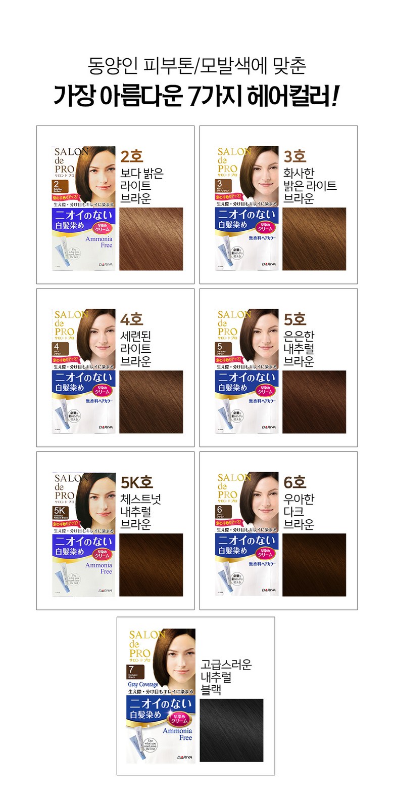 - 살롱드프로는 새치 염색약임에도 밝은 갈색부터 자연스러운 어두운 갈색까지 다양한 색상을 제공해, 무겁지 않은 컬러 선택이 가능한 것이 특징입니다.