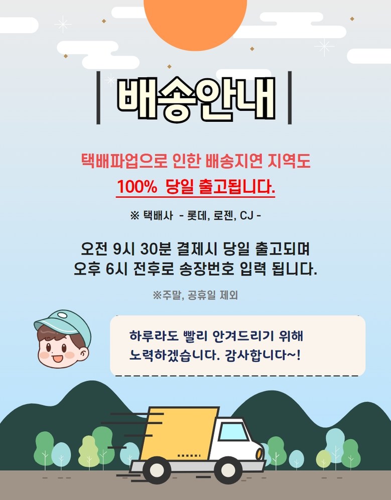 | 배송기간 | ㆍ도서산간 지역 등은 배송에 3-5일이 더 소요될 수 있습니다. - 천재지변, 물량 수급 변동 등 예외적인 사유 발생 시, 다소 지연될 수 있는 점 양해 부탁드립니다. | ||