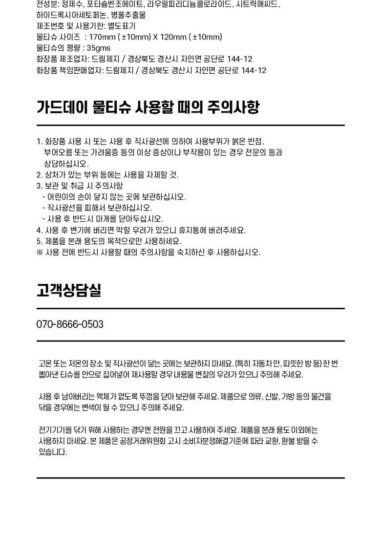 | 품명 및 모델명 | 가드데이 프리미엄 물티슈 | 인증/허가 사항 | 해당사항없음 |