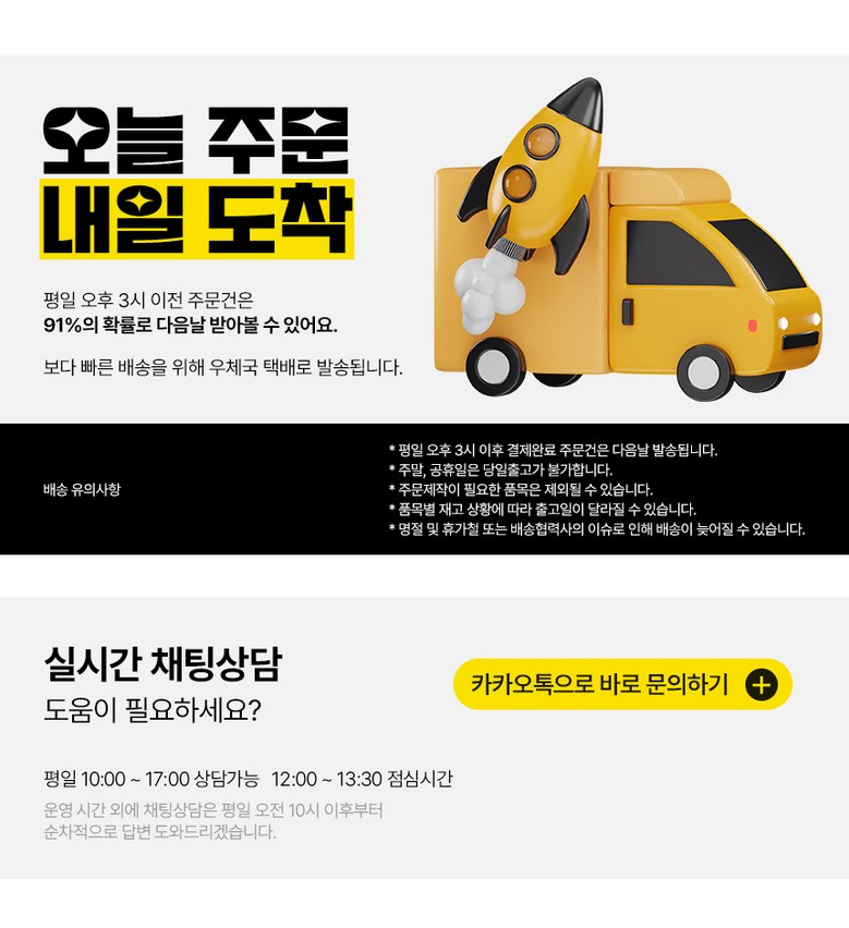 | 배송기간 | ㆍ도서산간 지역 등은 배송에 3-5일이 더 소요될 수 있습니다. - 천재지변, 물량 수급 변동 등 예외적인 사유 발생 시, 다소 지연될 수 있는 점 양해 부탁드립니다. | ||