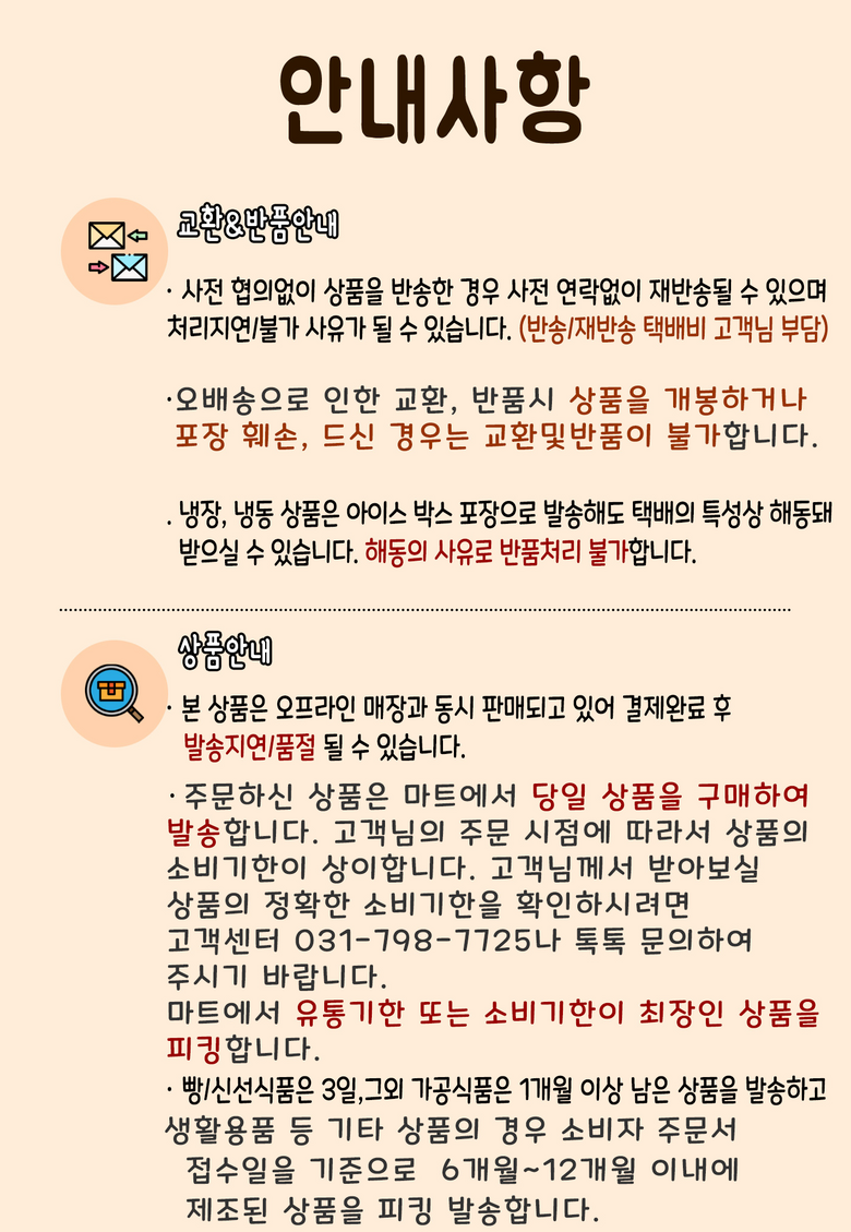 - ㆍ모니터 해상도의 차이로 인해 색상이나 이미지가 실제와 달라, 고객이 단순 변심으로 교환/반품을 무료로 요청하는 경우