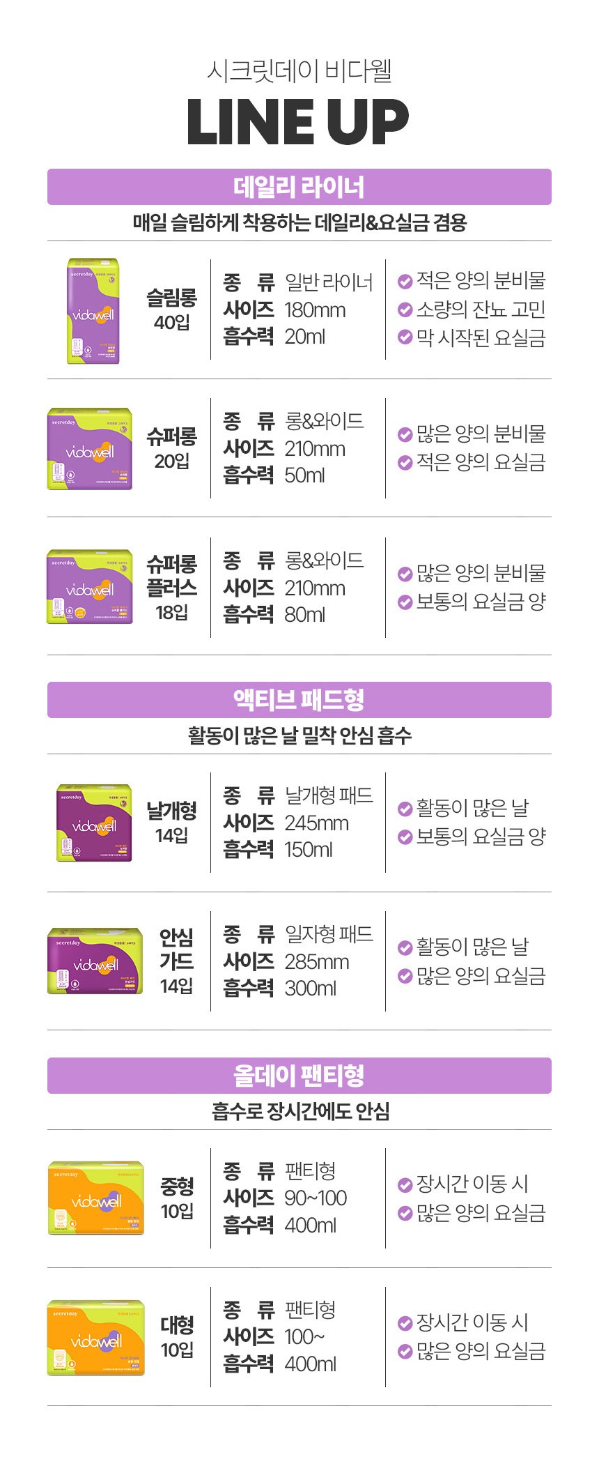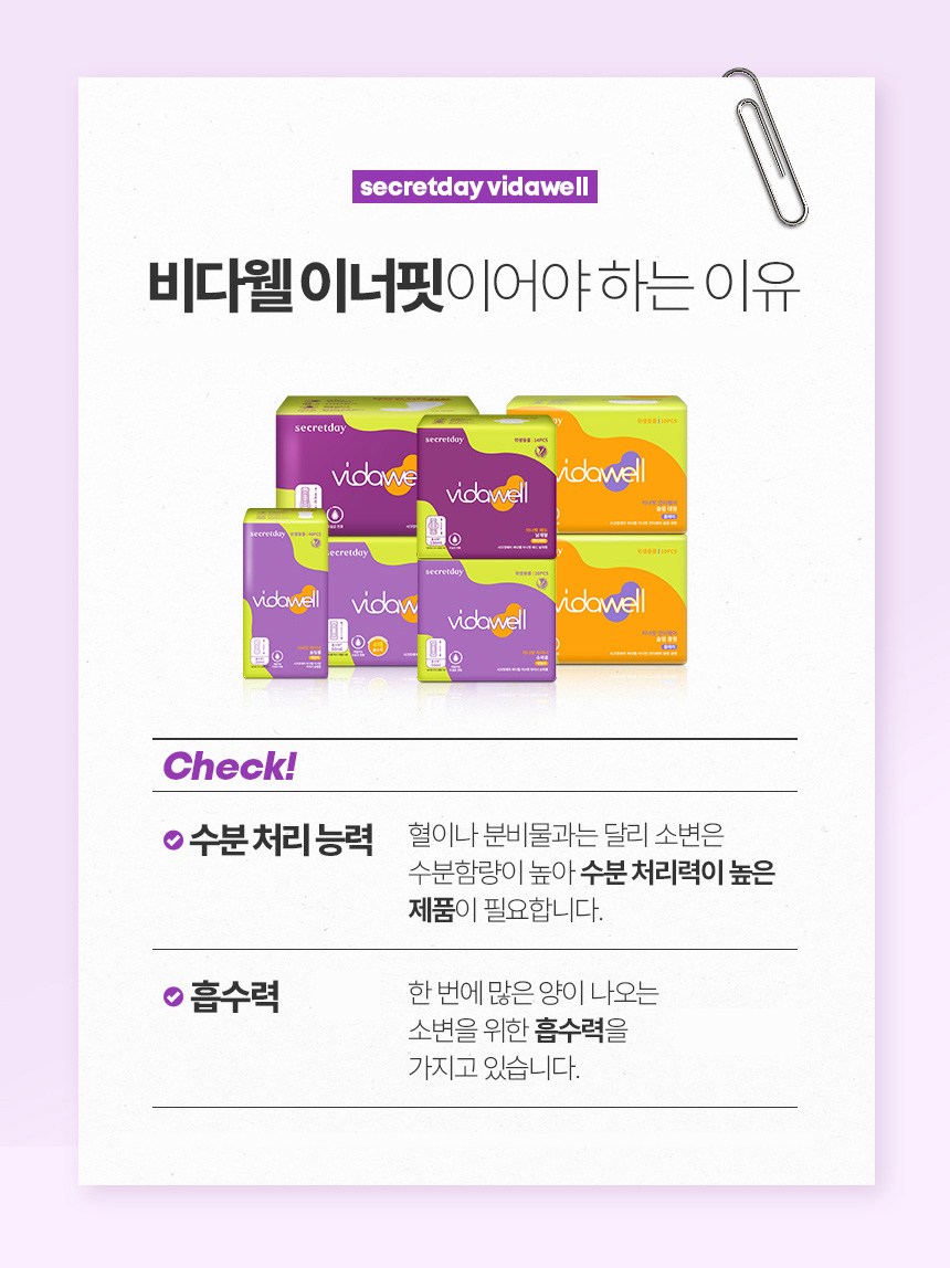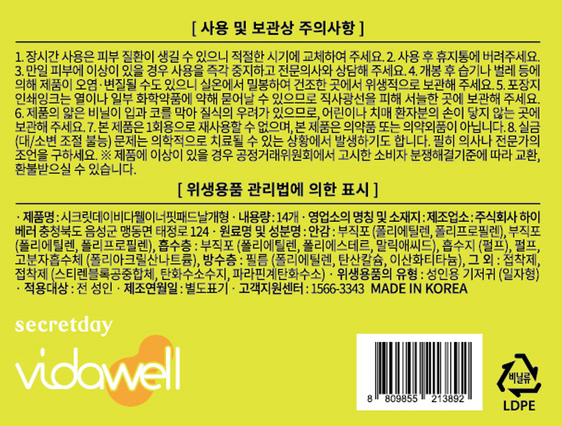 | 품명 및 모델명 | 시크릿데이비다웰이너핏패드날개형 | 인증/허가 사항 | 위생용품 |