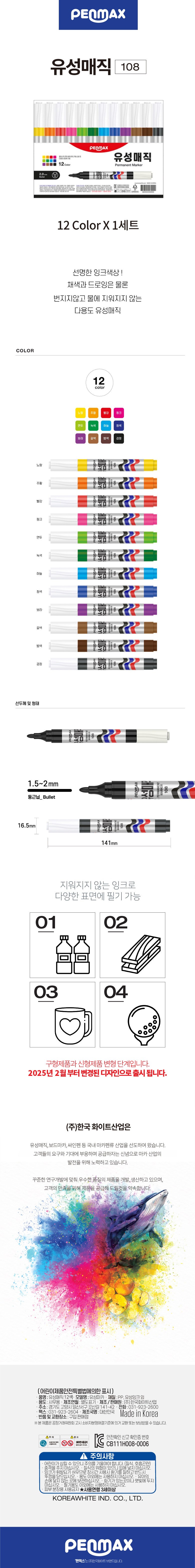 | 품명 및 모델명 | 펜맥스 유성매직 108 12색 세트 | KC 인증정보 | CB111H008-0006 |