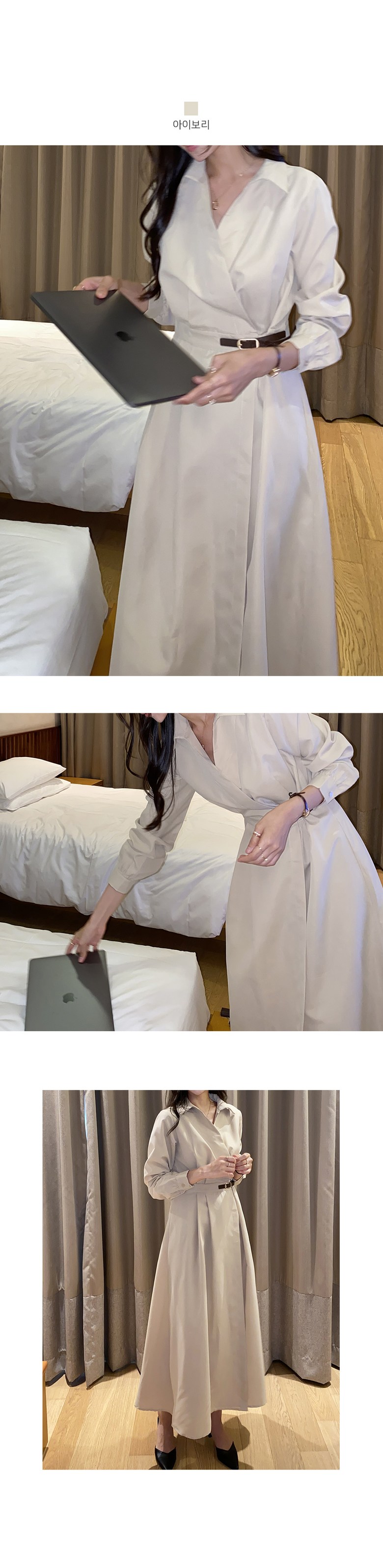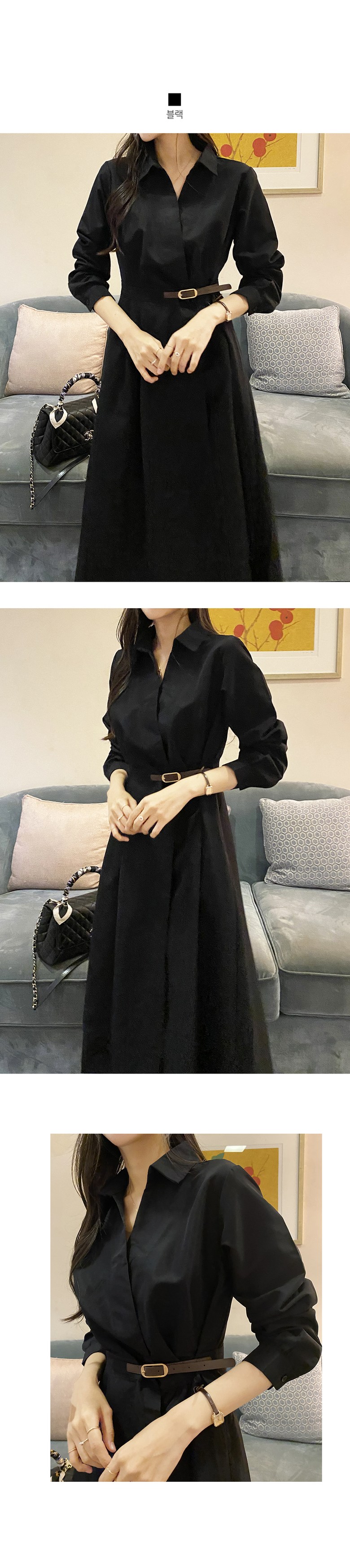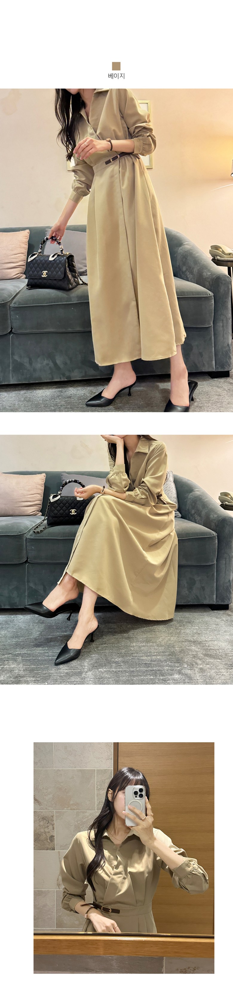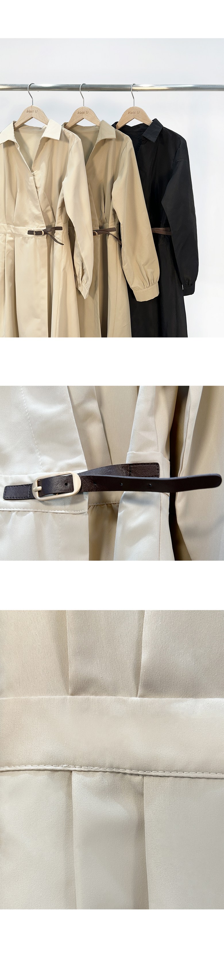블레스유 여성 봄 가을 벨트 프렌치 카라 롱 핀턱 랩 원피스 하객룩 데이트룩 데일리룩 허리조절 긴팔 브이넥
